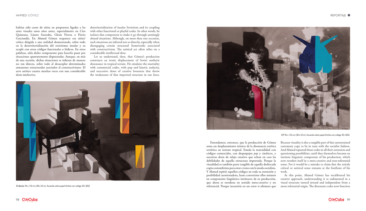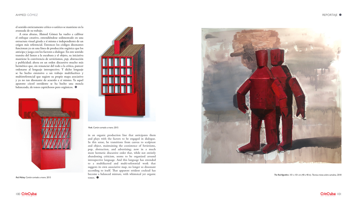 Let us understand, then, that Gómez’s production constructs an ironic displacement of Soviet aesthetic dissonance in tropical terrain. He emulates the martiality with commercial codes, with pop and kinetic audacity, and successive doses of creative looseness that throw the weaknesses of that imported structure in our faces. Because visuality is also a tangible part of that unrestrained customary copy to be in tune with the socialist fashion. And Ahmed repeated those codes in all their extension and questioning possibilities, until they themselves became an intrinsic linguistic component of his production, which now reorders itself in a meta-creative and non-referential sense. For it would be a mistake to claim that the strictly critical or satirical sense remains at the forefront of his work.