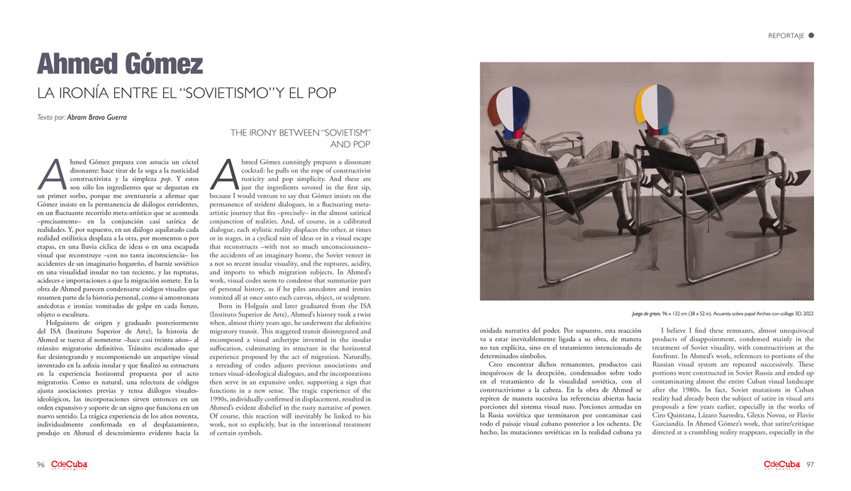 I believe I find these remnants, almost unequivocal products of disappointment, condensed mainly in the treatment of Soviet visuality, with constructivism at the forefront. In Ahmed’s work, references to portions of the Russian visual system are repeated successively. These portions were constructed in Soviet Russia and ended up contaminating almost the entire Cuban visual landscape after the 1980s. In fact, Soviet mutations in Cuban reality had already been the subject of satire in visual arts proposals a few years earlier, especially in the works of Ciro Quintana, Lázaro Saavedra, Glexis Novoa, or Flavio Garciandía. In Ahmed Gómez’s work, that satire/critique directed at a crumbling reality reappears, especially in the deterritorialization of insular Sovietism and its coupling with other functional or playful codes. In other words, he isolates that component to make it go through seemingly absurd situations. Although, on more than one occasion, such situations are inferred not so directly, especially when disengaging certain structural frameworks associated with constructivism. The satirical act often relies on a considerable intellectual dose.