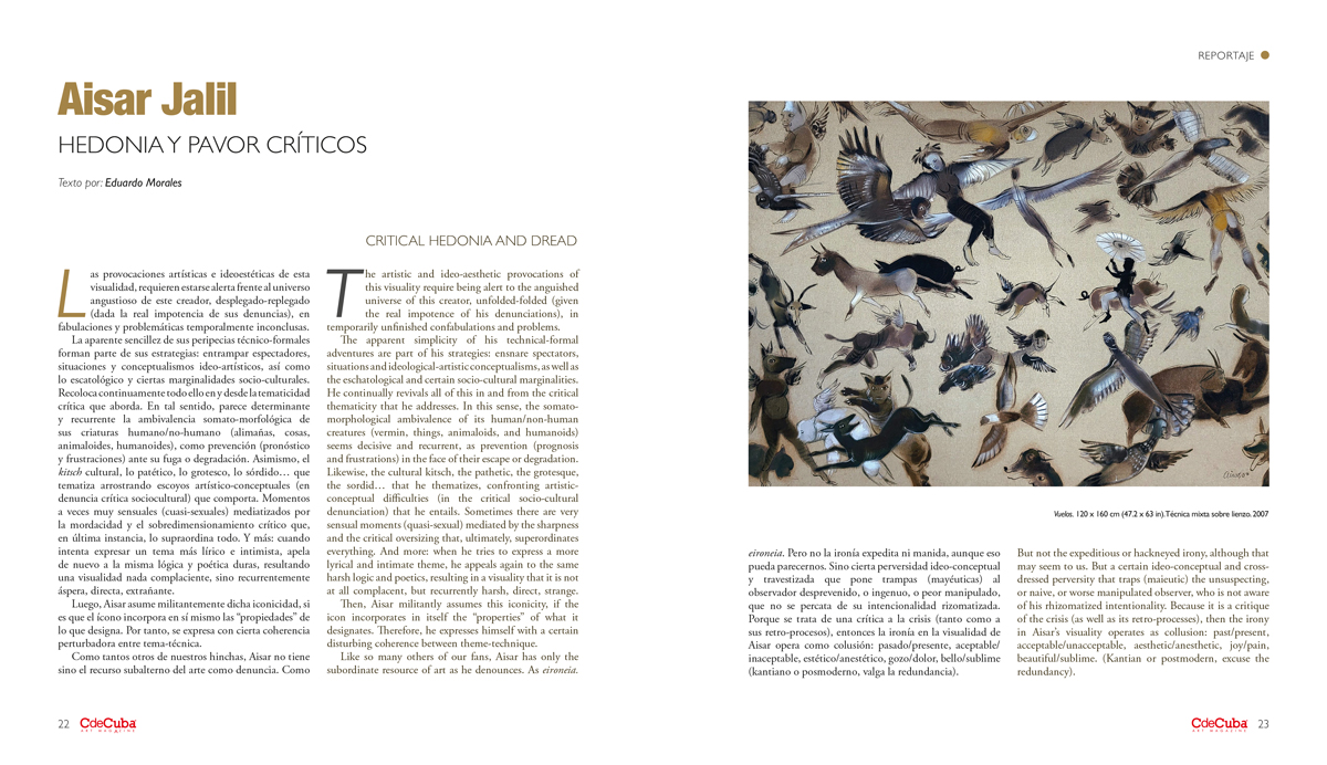 Like so many others of our fans, Aisar has only the subordinate resource of art as he denounces. As eironeia. But not the expeditious or hackneyed irony, although that may seem to us. But a certain ideo-conceptual and cross-dressed perversity that traps (maieutic) the unsuspecting, or naive, or worse manipulated observer, who is not aware of his rhizomatized intentionality. Because it is a critique of the crisis (as well as its retro-processes), then the irony in Aisar’s visuality operates as collusion: past/present, acceptable/unacceptable, aesthetic/anesthetic, joy/pain, beautiful/sublime. (Kantian or postmodern, excuse the redundancy).