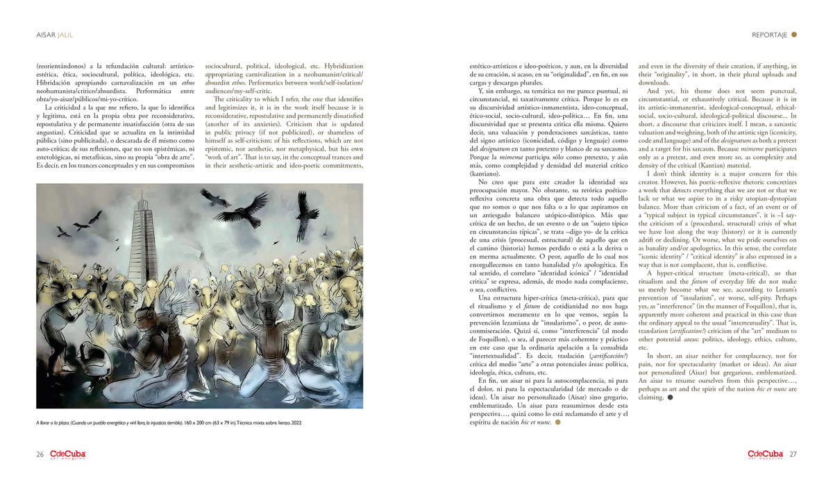 In short, an aisar neither for complacency, nor for pain, nor for spectacularity (market or ideas). An aisar not personalized (Aisar) but gregarious, emblematized. An aisar to resume ourselves from this perspective…, perhaps as art and the spirit of the nation hic et nunc are claiming.