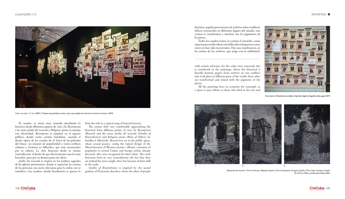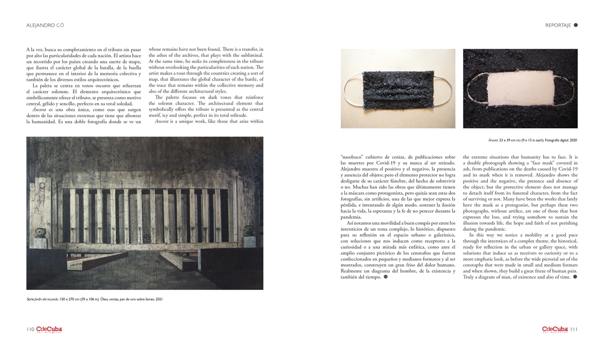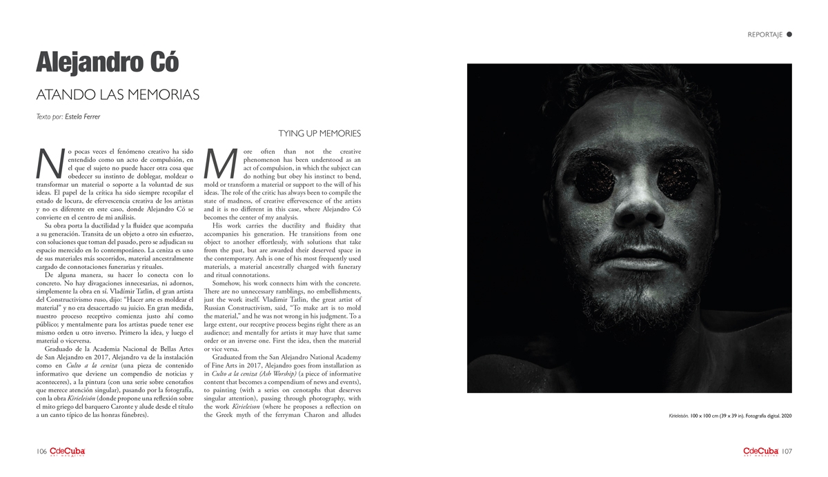 Graduated from the San Alejandro National Academy of Fine Arts in 2017, Alejandro goes from installation as in Culto a la ceniza (Ash Worship) (a piece of informative content that becomes a compendium of news and events), to painting (with a series on cenotaphs that deserves singular attention), passing through photography, with the work Kirieleison (where he proposes a reflection on the Greek myth of the ferryman Charon and alludes from the title to a typical song of funeral honors).