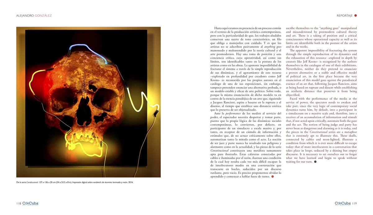 Faced with the performance of the media at the service of power, the spectator needs to awaken and take part, since the very logic of contemporary social dynamics turns him, by default, into a participant in a simulacrum on a massive scale and, therefore, into a receiver of an accumulation of information and stimuli that, if not acted upon critically, automate both the gaze and the act. The notion of being judge and party has never been as dangerous and alarming as it is today, and the pieces in the Constitutional series are a metaphor that is extremely apt to illustrate this. These skulls, connected by cables and neon-lighted, illustrate a condition from which it is ever more difficult to escape today: that of mute interlocutors in a conversation that takes place in loops, seduced by a shining but empty discourse. It is necessary to set ourselves out to forget what we have learned and begin to speak without waiting for our turn.