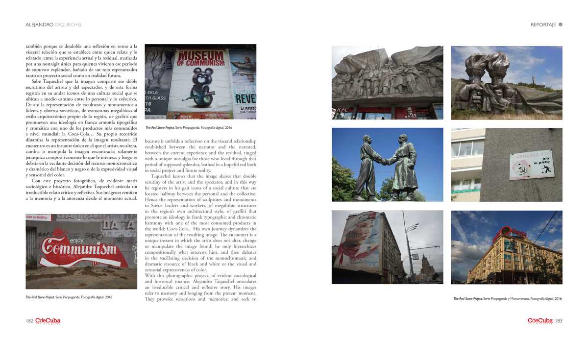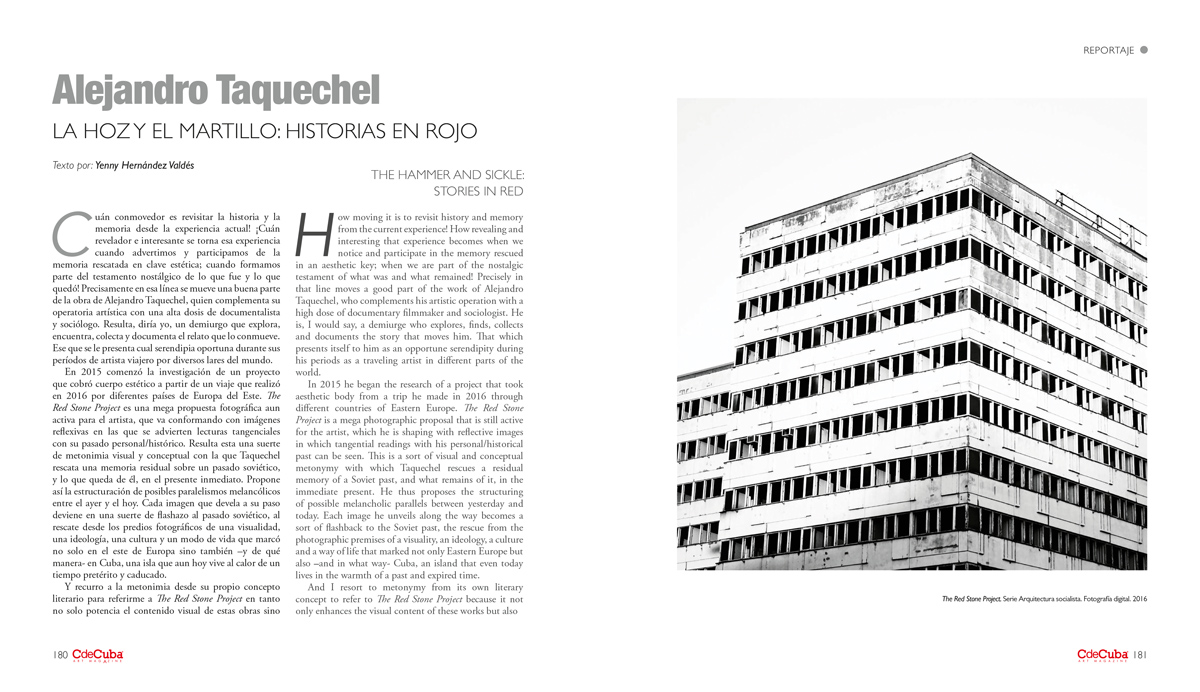 In 2015 he began the research of a project that took aesthetic body from a trip he made in 2016 through different countries of Eastern Europe. The Red Stone Project is a mega photographic proposal that is still active for the artist, which he is shaping with reflective images in which tangential readings with his personal/historical past can be seen. This is a sort of visual and conceptual metonymy with which Taquechel rescues a residual memory of a Soviet past, and what remains of it, in the immediate present. He thus proposes the structuring of possible melancholic parallels between yesterday and today. Each image he unveils along the way becomes a sort of flashback to the Soviet past, the rescue from the photographic premises of a visuality, an ideology, a culture and a way of life that marked not only Eastern Europe but also –and in what way- Cuba, an island that even today lives in the warmth of a past and expired time.