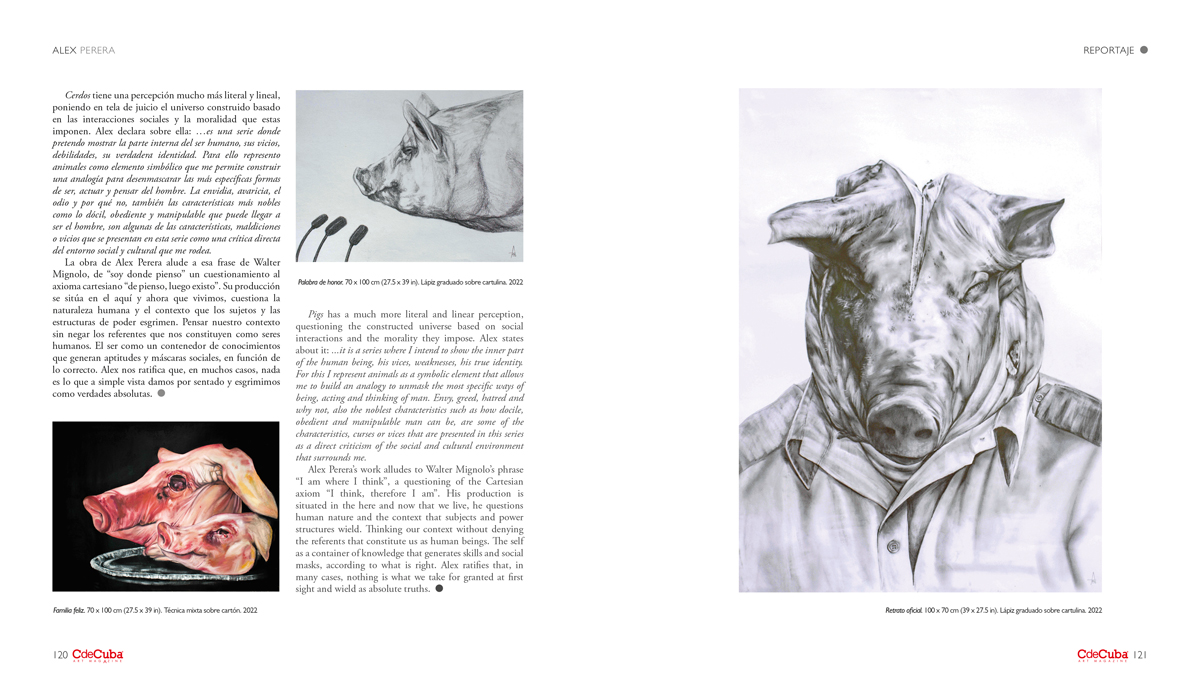 Pigs has a much more literal and linear perception, questioning the constructed universe based on social interactions and the morality they impose. Alex states about it: …it is a series where I intend to show the inner part of the human being, his vices, weaknesses, his true identity. For this I represent animals as a symbolic element that allows me to build an analogy to unmask the most specific ways of being, acting and thinking of man. Envy, greed, hatred and why not, also the noblest characteristics such as how docile, obedient and manipulable man can be, are some of the characteristics, curses or vices that are presented in this series as a direct criticism of the social and cultural environment that surrounds me.