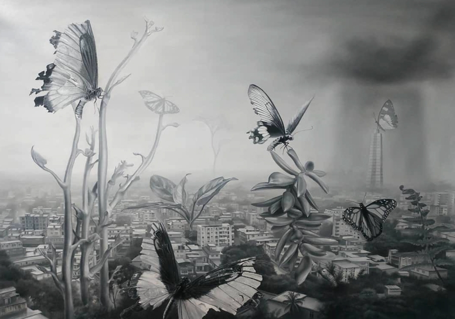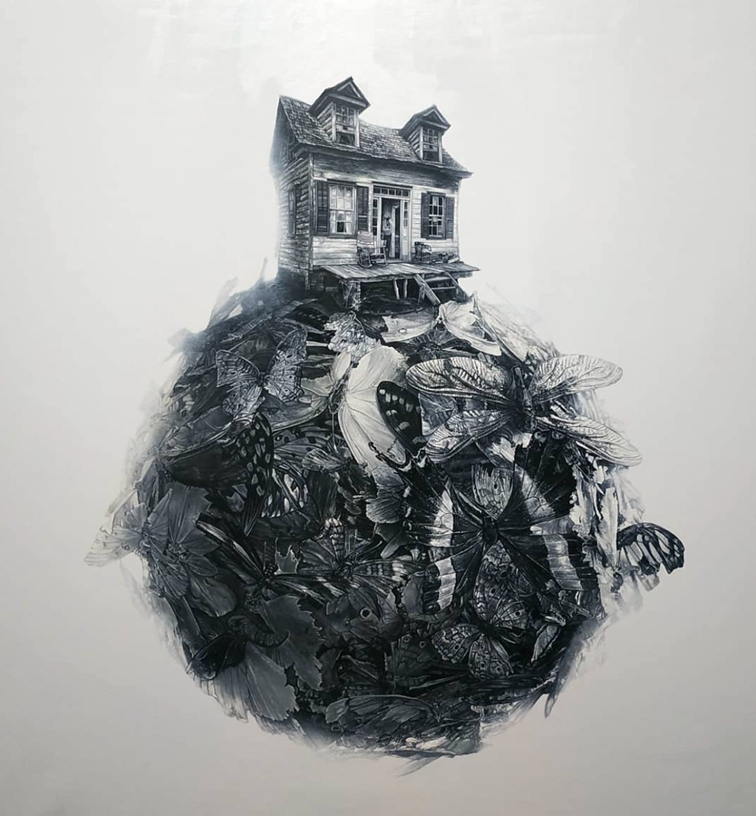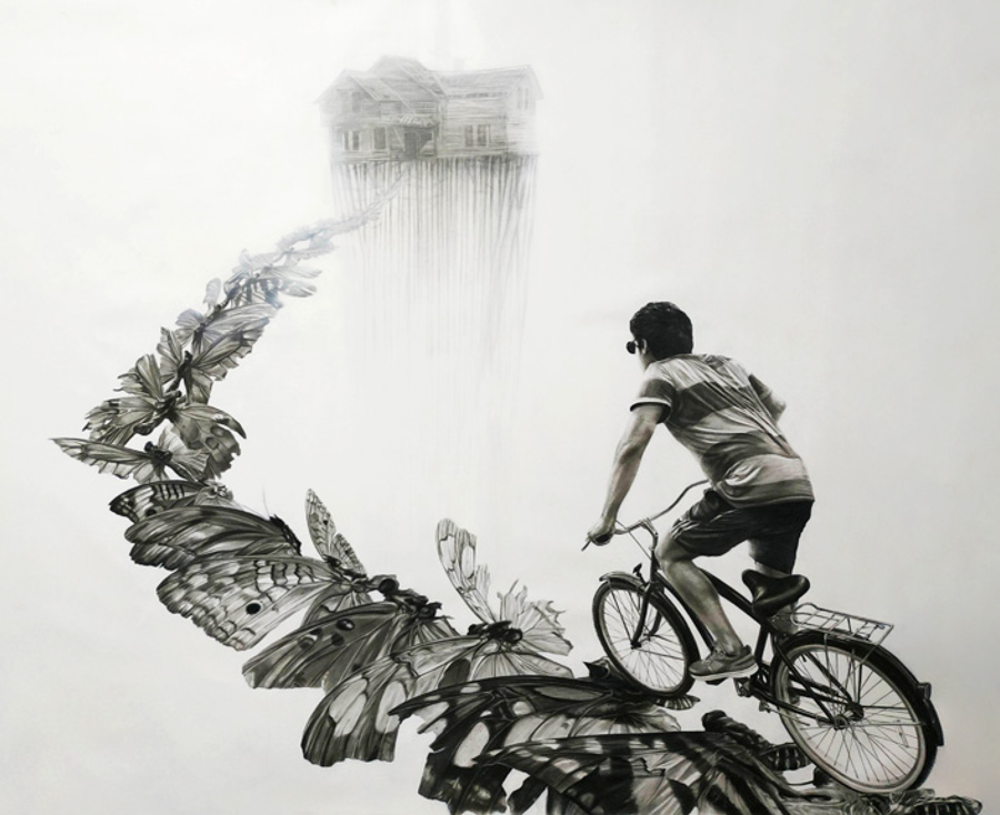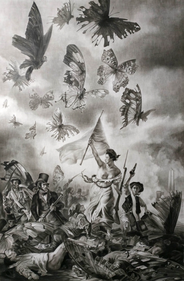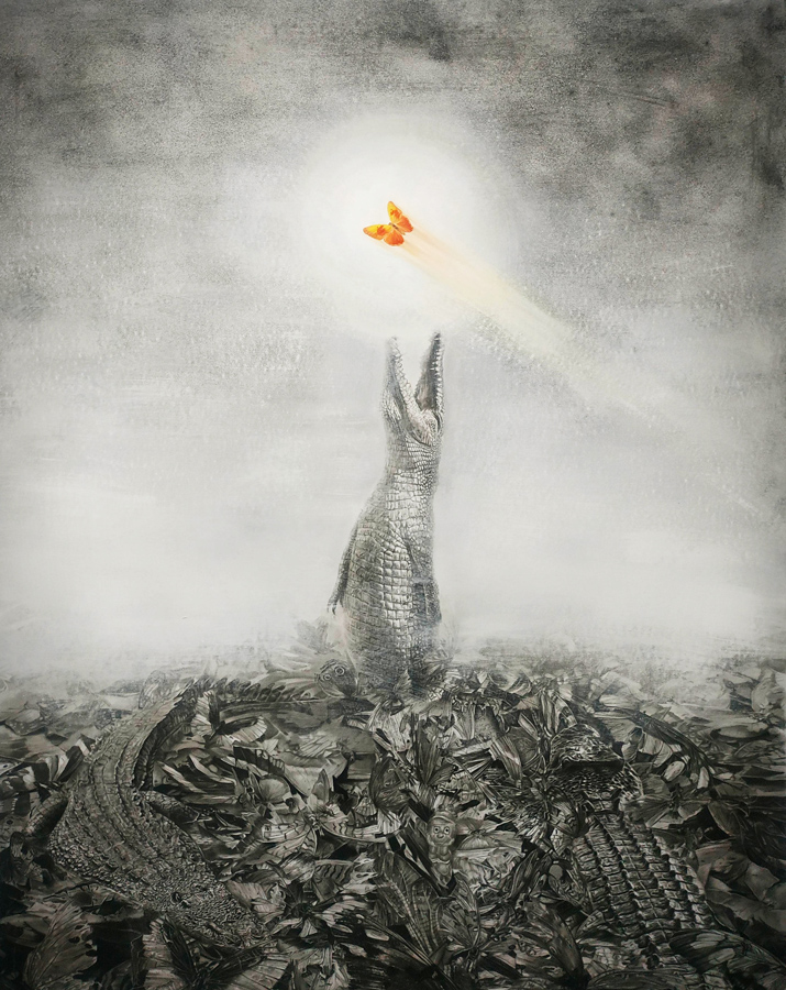 Angel works a lot with the image of the butterfly, which seems to me a daring thing to do in these days when everything beautiful has been accused of kitsch, because this insect has been as degraded in its visual representation as the swan or the rose. But as it happens in the aphorism “a rose is a rose”, a poem by Gertrude Stein that alludes to a verse by Shakespiere (“The rose would not cease to be a rose, and to spread its scent, even if it were called by another name”), neither does a butterfly cease to be what it is no matter how much its image is trivialized.