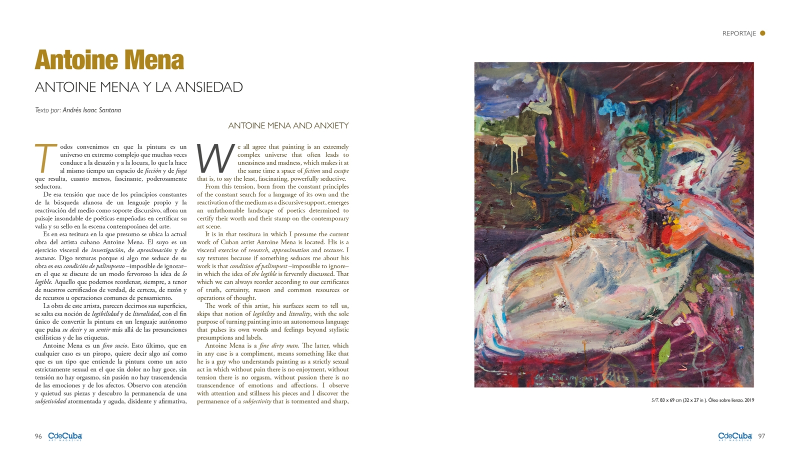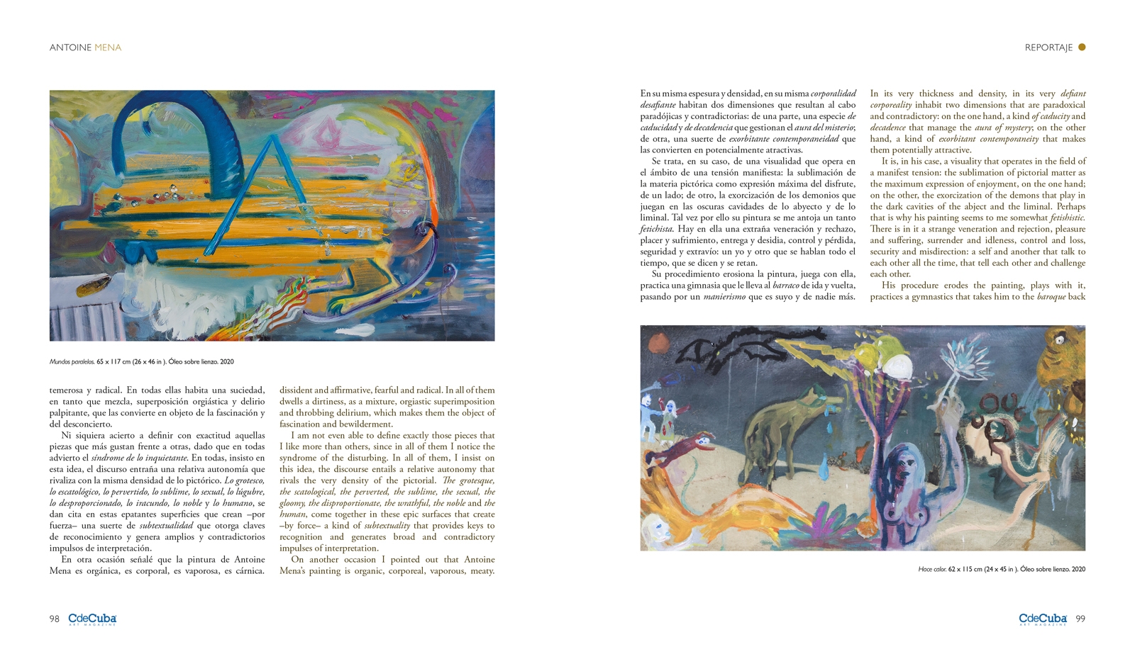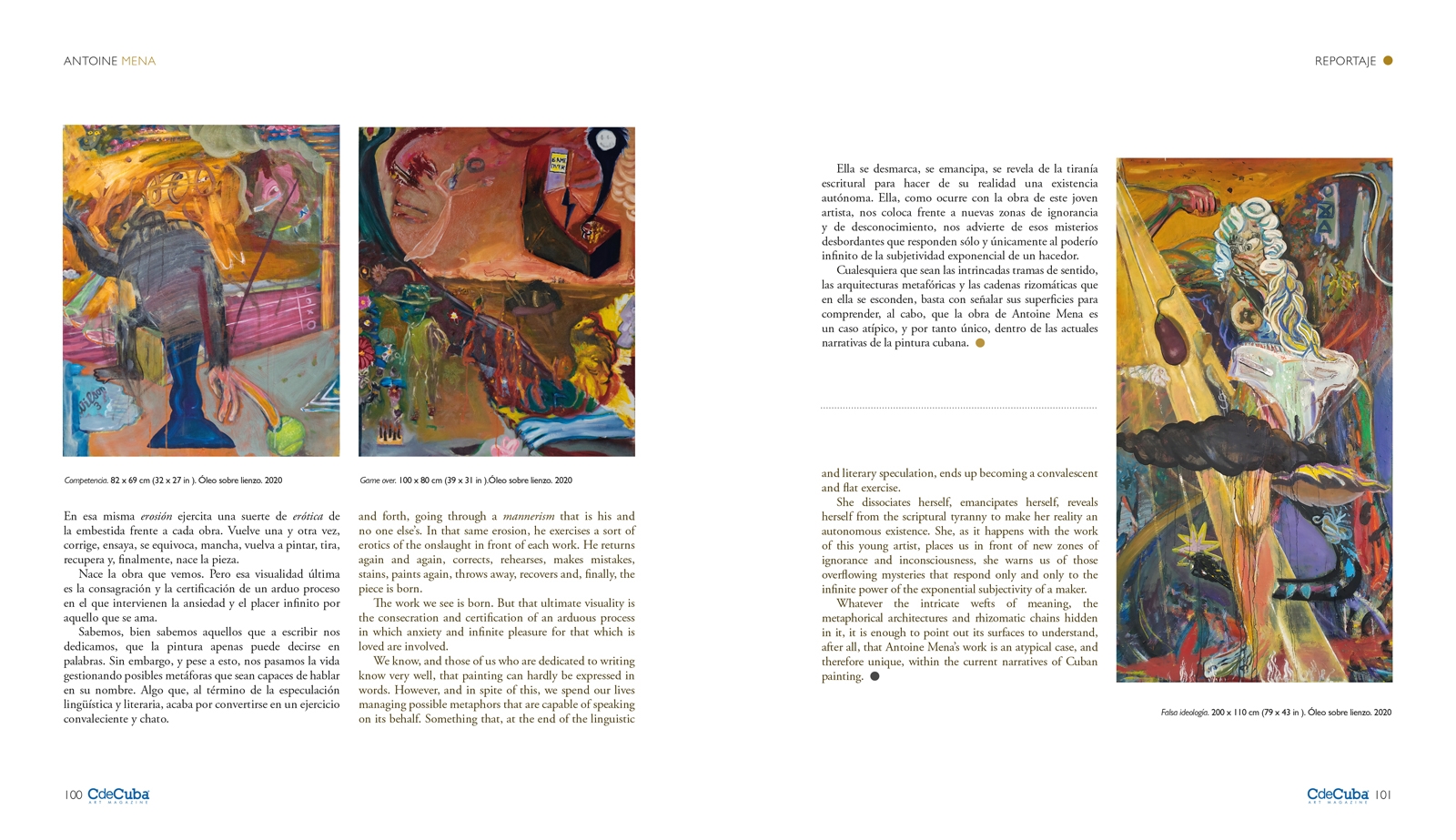 Whatever the intricate wefts of meaning, the metaphorical architectures and rhizomatic chains hidden in it, it is enough to point out its surfaces to understand, after all, that Antoine Mena’s work is an atypical case, and therefore unique, within the current narratives of Cuban painting.