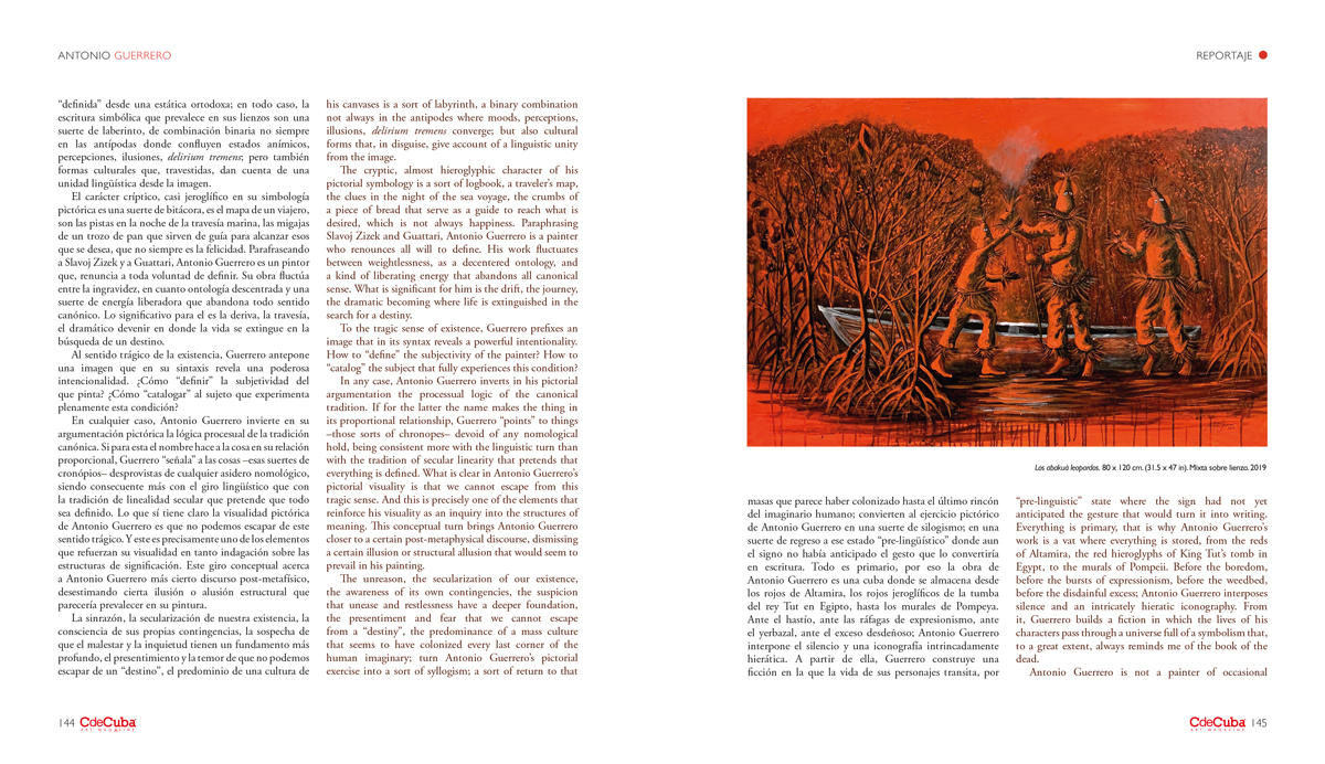 The cryptic, almost hieroglyphic character of his pictorial symbology is a sort of logbook, a traveler’s map, the clues in the night of the sea voyage, the crumbs of a piece of bread that serve as a guide to reach what is desired, which is not always happiness. Paraphrasing Slavoj Zizek and Guattari, Antonio Guerrero is a painter who renounces all will to define. His work fluctuates between weightlessness, as a decentered ontology, and a kind of liberating energy that abandons all canonical sense. What is significant for him is the drift, the journey, the dramatic becoming where life is extinguished in the search for a destiny.