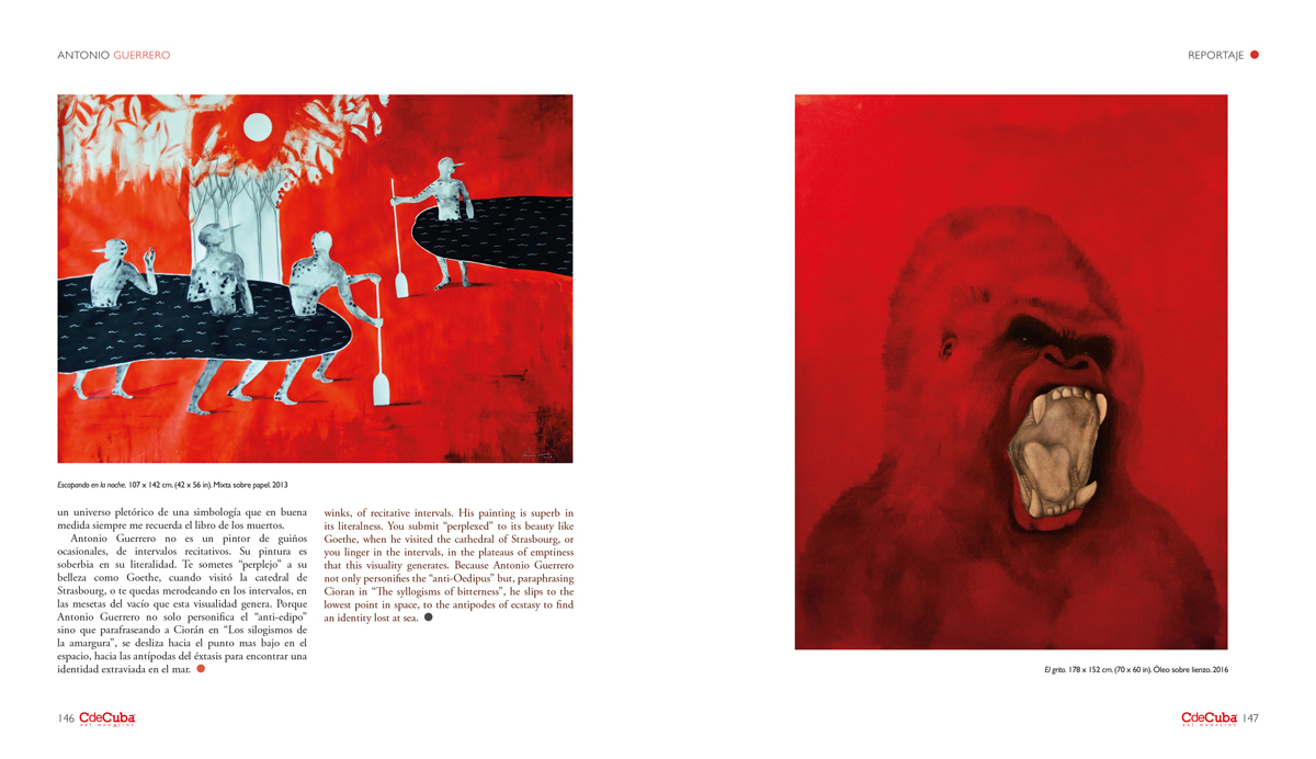 Antonio Guerrero is not a painter of occasional winks, of recitative intervals. His painting is superb in its literalness. You submit “perplexed” to its beauty like Goethe, when he visited the cathedral of Strasbourg, or you linger in the intervals, in the plateaus of emptiness that this visuality generates. Because Antonio Guerrero not only personifies the “anti-Oedipus” but, paraphrasing Cioran in “The syllogisms of bitterness”, he slips to the lowest point in space, to the antipodes of ecstasy to find an identity lost at sea.