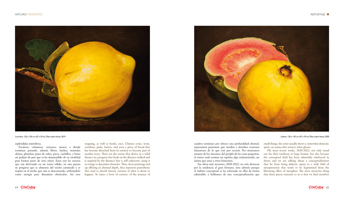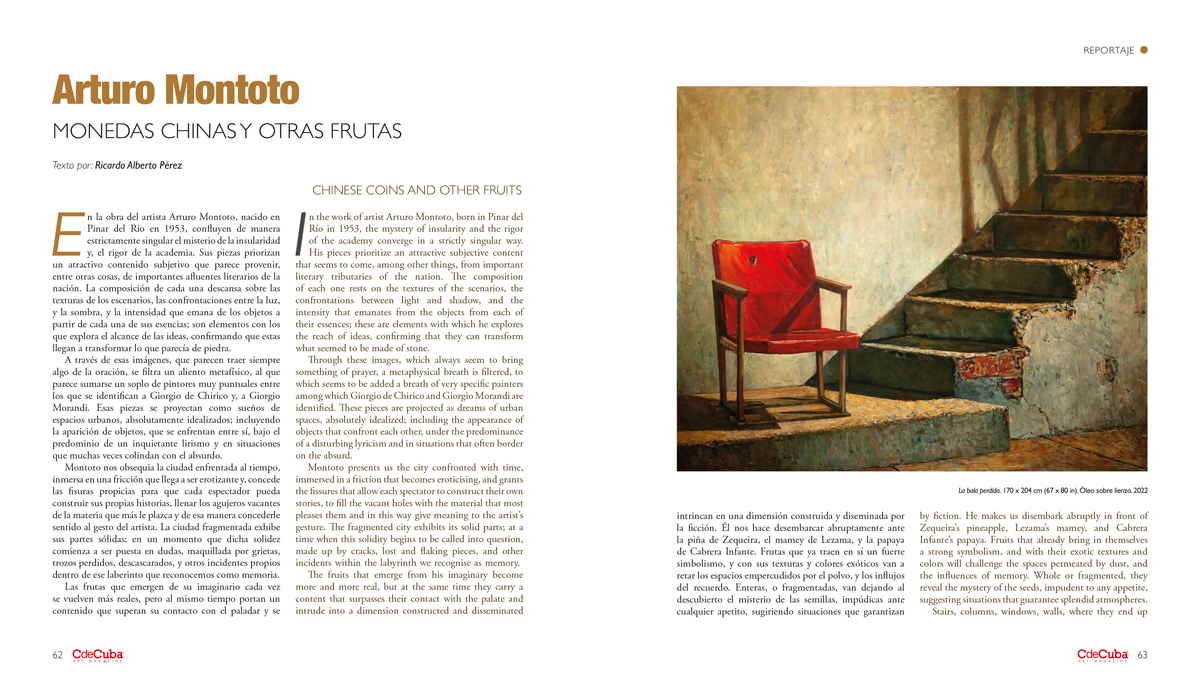In the work of artist Arturo Montoto, born in Pinar del Río in 1953, the mystery of insularity and the rigor of the academy converge in a strictly singular way. His pieces prioritize an attractive subjective content that seems to come, among other things, from important literary tributaries of the nation. The composition of each one rests on the textures of the scenarios, the confrontations between light and shadow, and the intensity that emanates from the objects from each of their essences; these are elements with which he explores the reach of ideas, confirming that they can transform what seemed to be made of stone.