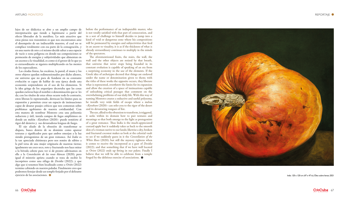 The eye, allied to the obsession to transform, is triggered, it seeks within its domain how to pair textures and meanings so that both emerge to the light as protagonists of a great romance. Thus India is the much-appreciated custard apple but it suddenly takes us back to the smooth skin of a woman native to our lands; likewise a dry, broken and fractured coconut makes us look at the celestial vault to see if we suddenly guess in it the Constellation of the White Roses (2020); but still the mystery tightens when it comes to receive the incorporeal as a gust of Desidia (2022); and that something that if we have well located as Orion (2022) ends up fitting in our palate. Finally I believe that we will be able to celebrate from a temple forged by the delirious exercise of associations.