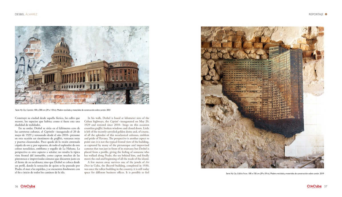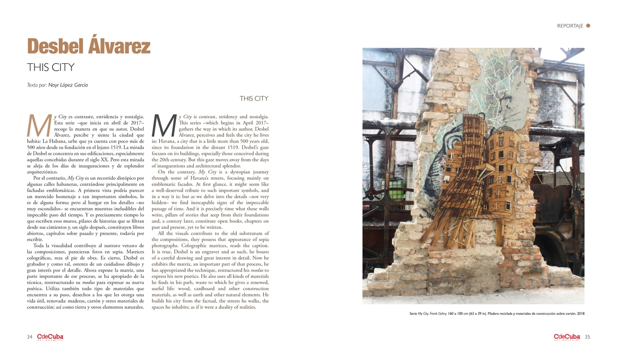 On the contrary, My City is a dystopian journey through some of Havana’s streets, focusing mainly on emblematic facades. At first glance, it might seem like a well-deserved tribute to such important symbols, and in a way it is; but as we delve into the details –not very hidden– we find inescapable signs of the impeccable passage of time. And it is precisely time what these walls write, pillars of stories that seep from their foundations and, a century later, constitute open books, chapters on past and present, yet to be written.