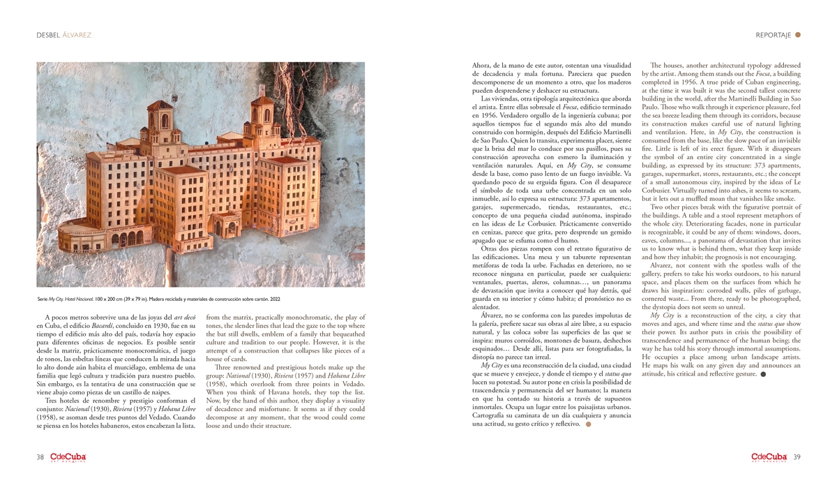 The houses, another architectural typology addressed by the artist. Among them stands out the Focsa, a building completed in 1956. A true pride of Cuban engineering, at the time it was built it was the second tallest concrete building in the world, after the Martinelli Building in Sao Paulo. Those who walk through it experience pleasure, feel the sea breeze leading them through its corridors, because its construction makes careful use of natural lighting and ventilation. Here, in My City, the construction is consumed from the base, like the slow pace of an invisible fire. Little is left of its erect figure. With it disappears the symbol of an entire city concentrated in a single building, as expressed by its structure: 373 apartments, garages, supermarket, stores, restaurants, etc.; the concept of a small autonomous city, inspired by the ideas of Le Corbusier. Virtually turned into ashes, it seems to scream, but it lets out a muffled moan that vanishes like smoke.
