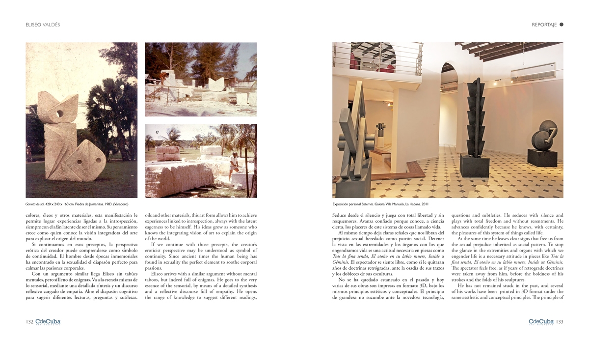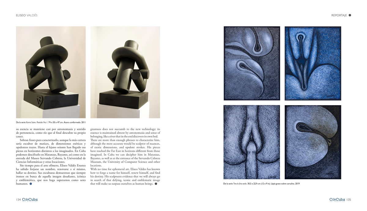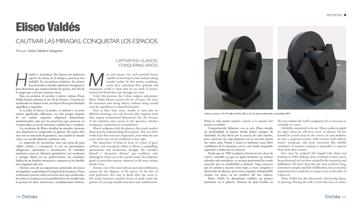Under this premise, the Cuban sculptor and painter Eliseo Valdes Erustes masters the art of forms. He turns the inanimate into living objects, without being carried away by superfluous or repeated formulas.