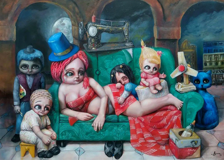 Each of Enrique Alfonso’s paintings is imbued with stories and symbolism. His works resemble altarpieces, using everyday objects that evoke memories shared by many generations of Cubans, to narrate meaningful stories. His main objective is to establish an emotional connection with the viewer, capturing the deepest human feelings on canvas.