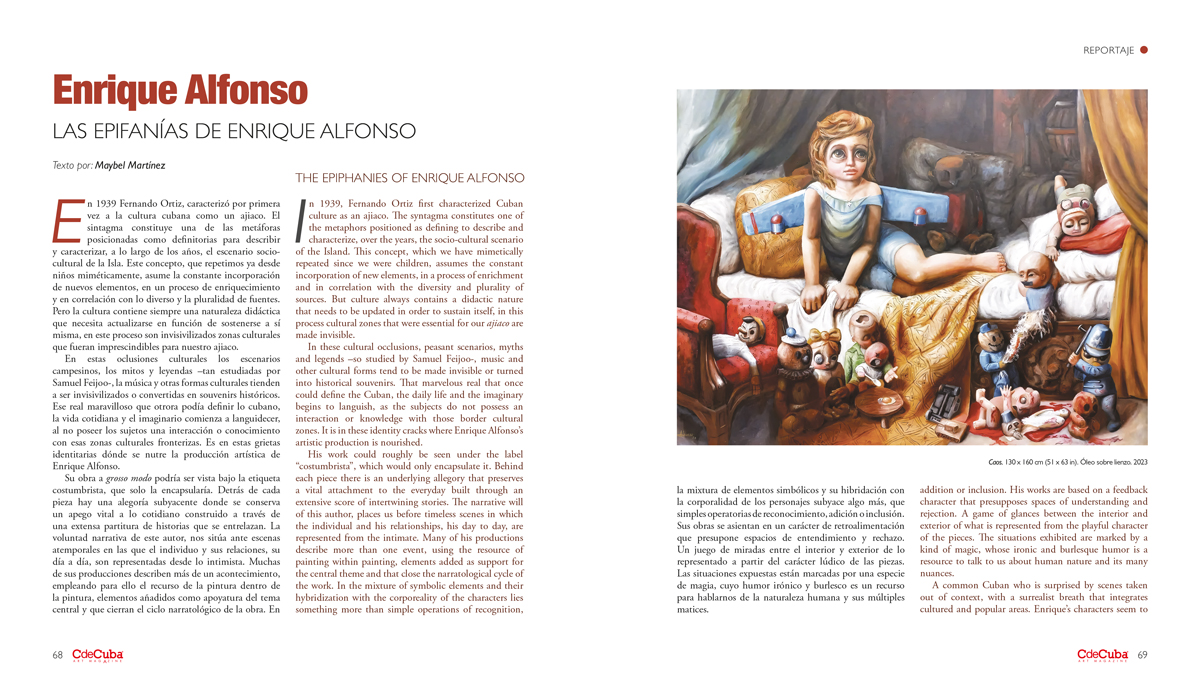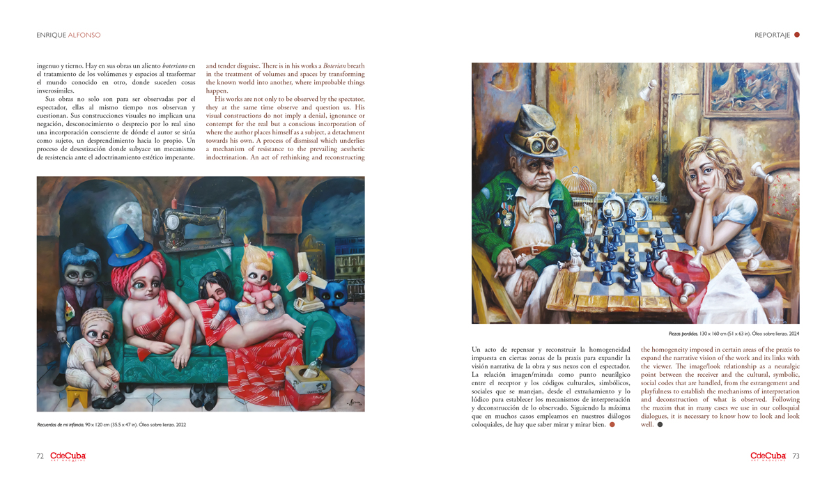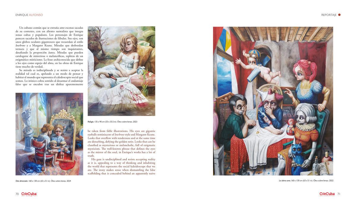 A common Cuban who is surprised by scenes taken out of context, with a surrealist breath that integrates cultured and popular areas. Enrique’s characters seem to be taken from fable illustrations. His eyes are gigantic eyeballs reminiscent of lowbrow style and Margaret Keane. Looks that overflow with tenderness and at the same time are disturbing, defying the golden ratio. Looks that can be classified as mysterious or melancholic, full of enigmatic mysticism. The well-known phrase that defines the eyes as the mirror of the soul, in Enrique’s works has a lot of truth.