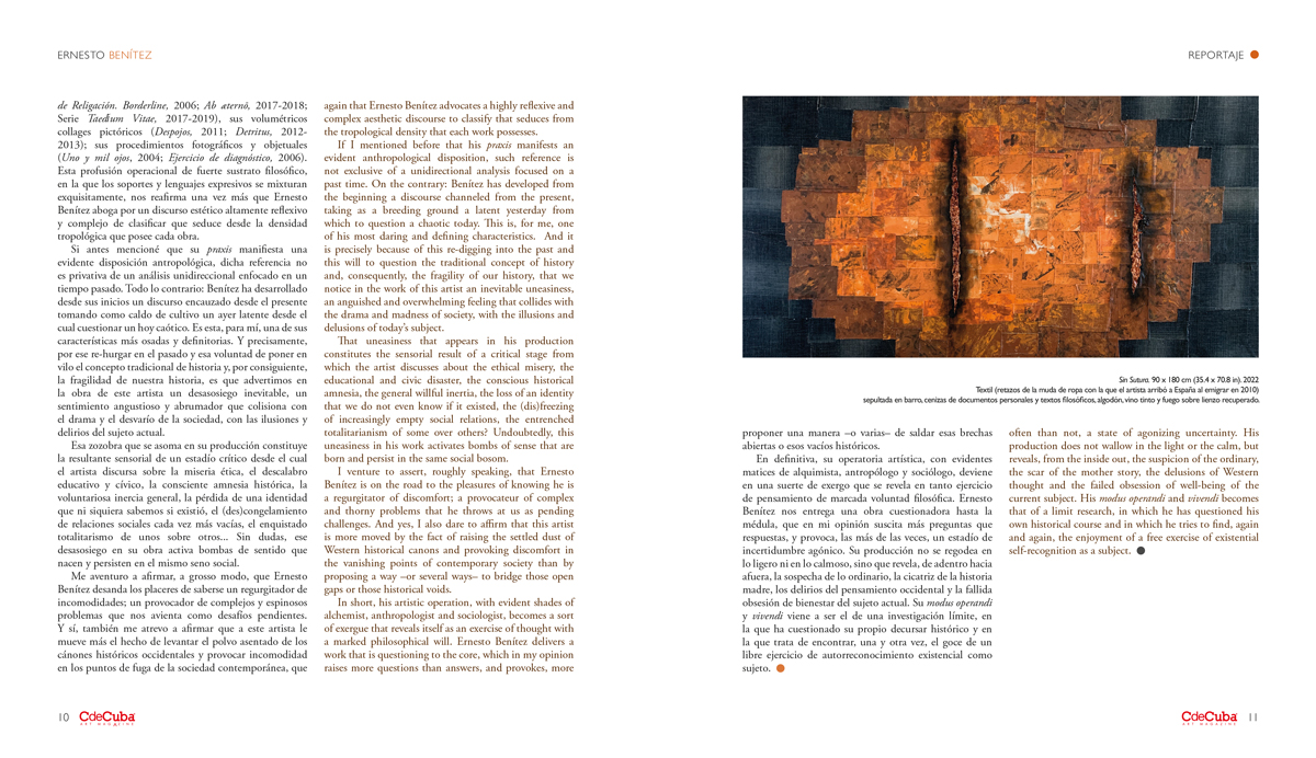 Since his emergence on the Cuban scene in the late 1980s and during his career in the 1990s, Ernesto Benítez has maintained a solid discourse around an ontological concern for the subject, the Self and his relationship with the environment and the Other. Undoubtedly, in the following years his gaze has sharpened and his work has drifted to thick conceptual levels that evidence a commitment and concern with his personal and collective temporality, permeated by the European contextual dynamics in which he has been unfolding for more than ten years. And in the midst of the crusade to “look for himself”, as a Heraclitian principle on which he bases his purpose, he continues to propose, in his most recent deliveries, an existential chronicle in which, in addition to questioning the laceration and daily differences suffered by the subject in this time, he emphasizes the splitting of what he has called “cultural wound”.