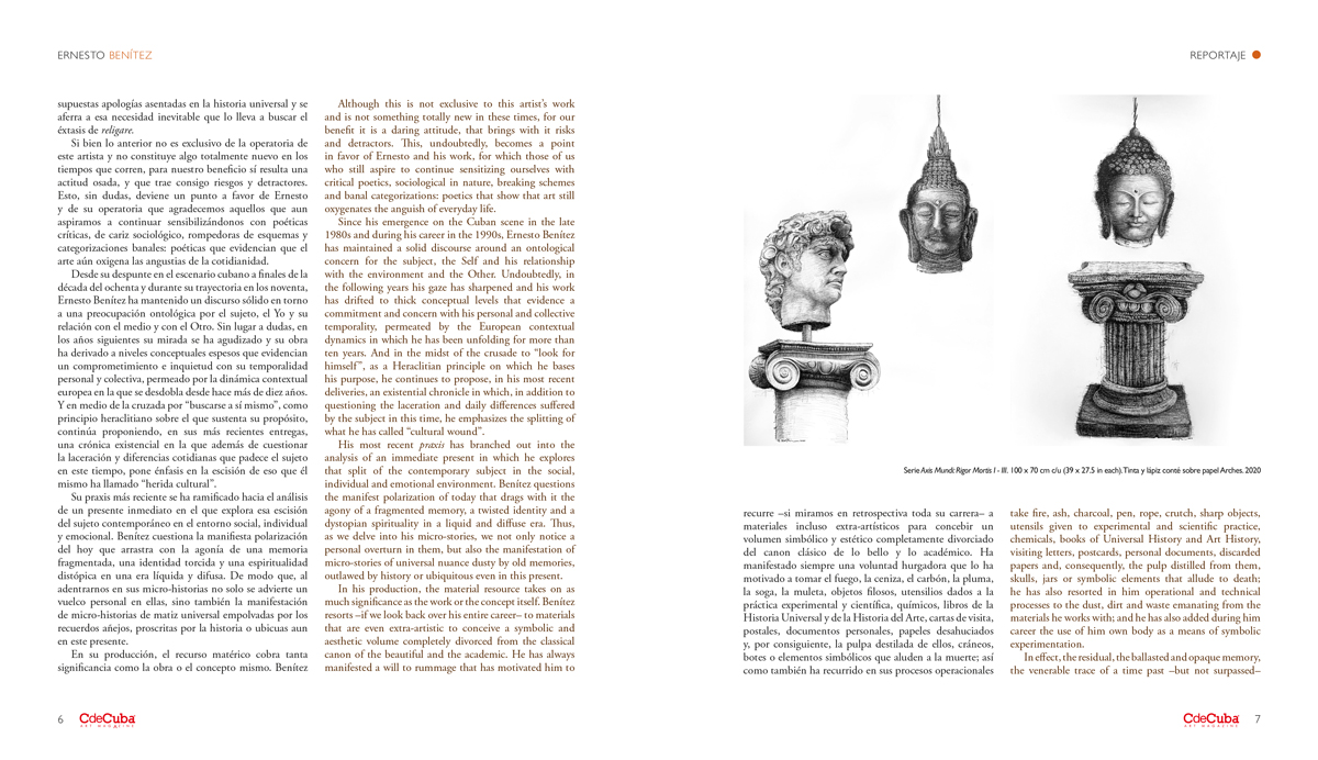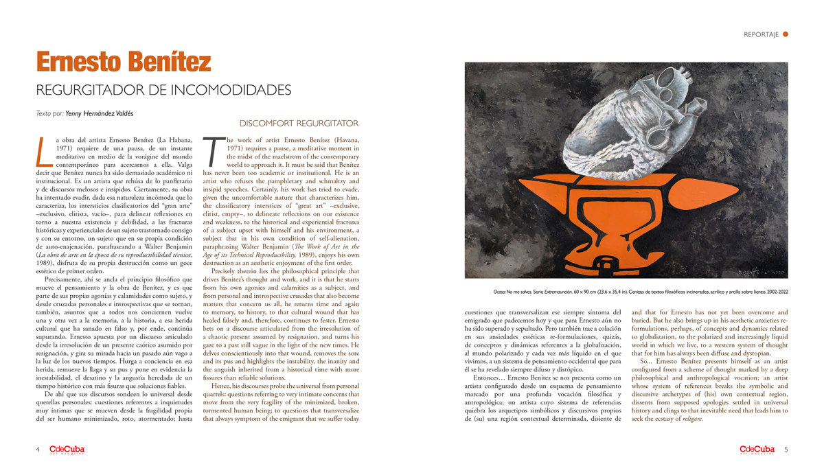 The work of artist Ernesto Benítez (Havana, 1971) requires a pause, a meditative moment in the midst of the maelstrom of the contemporary world to approach it. It must be said that Benítez has never been too academic or institutional. He is an artist who refuses the pamphletary and schmaltzy and insipid speeches. Certainly, his work has tried to evade, given the uncomfortable nature that characterizes him, the classificatory interstices of “great art” –exclusive, elitist, empty–, to delineate reflections on our existence and weakness, to the historical and experiential fractures of a subject upset with himself and his environment, a subject that in his own condition of self-alienation, paraphrasing Walter Benjamin (The Work of Art in the Age of its Technical Reproducibility, 1989), enjoys his own destruction as an aesthetic enjoyment of the first order.