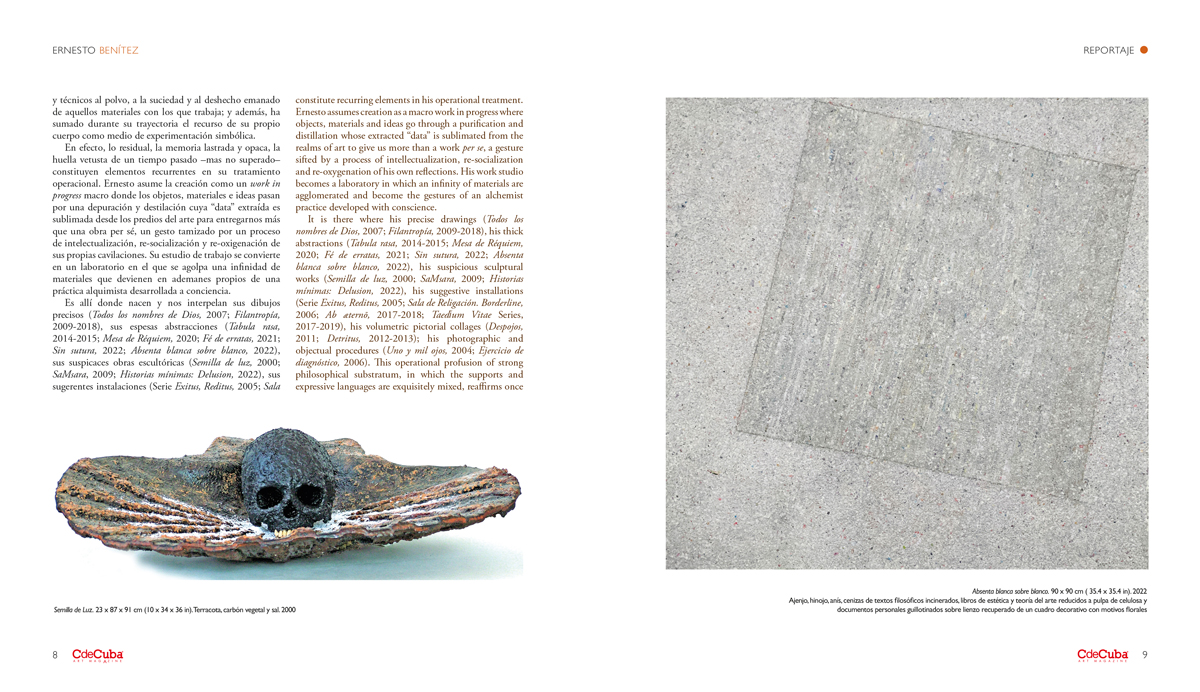 It is there where his precise drawings (Todos los nombres de Dios, 2007; Filantropía, 2009-2018), his thick abstractions (Tabula rasa, 2014-2015; Mesa de Réquiem, 2020; Fé de erratas, 2021; Sin sutura, 2022; Absenta blanca sobre blanco, 2022), his suspicious sculptural works (Semilla de luz, 2000; SaMsara, 2009; Historias mínimas: Delusion, 2022), his suggestive installations (Serie Exitus, Reditus, 2005; Sala de Religación. Borderline, 2006; Ab æternō, 2017-2018; Taedĭum Vitae Series, 2017-2019), his volumetric pictorial collages (Despojos, 2011; Detritus, 2012-2013); his photographic and objectual procedures (Uno y mil ojos, 2004; Ejercicio de diagnóstico, 2006). This operational profusion of strong philosophical substratum, in which the supports and expressive languages are exquisitely mixed, reaffirms once again that Ernesto Benítez advocates a highly reflexive and complex aesthetic discourse to classify that seduces from the tropological density that each work possesses.