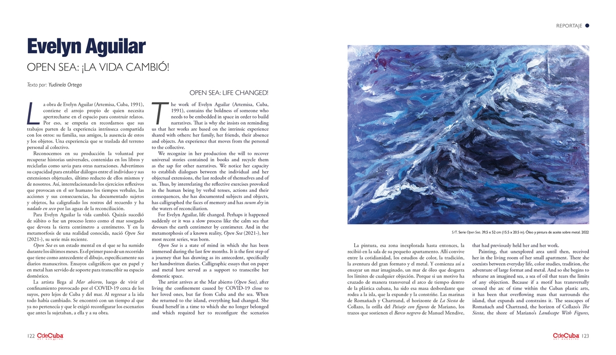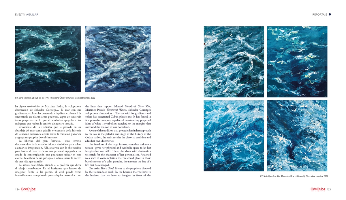 Open Sea or Mar abierto because the soul that lives in that structure of blood and water needed to wake up. She longed to return to govern the order of the pre-existing factors that condition life every day. For Evelyn Aguilar these are times to open the doors, to see and listen with all her senses to the world she builds, after that moment –with the sea in the background– when life changed.