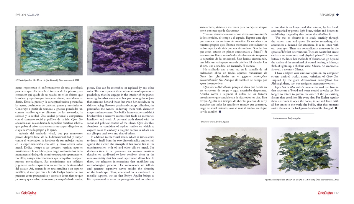 In addition to the visual result, which at times seems to detach itself from the two-dimensionality and set sail against the viewer, the strength of her works lies in the experimentation with oil and other oils on metal. She dedicates time to her processes, she versions maritime sketches on cardboard to later confront them in the monumentality that her small apartment allows her. In them, she rehearses interventions that annihilate any methodological process. Her movements are telluric and generate expansive waves amidst the sinuosity of the landscape. Thus, contained in a cardboard or metallic support, the sea that Evelyn Aguilar brings to life is presented to us as the protagonist and correlate of a time that is no longer and that returns, by her hand, accompanied by greens, light blues, violets and browns to avoid being trapped by the context that disallows it.