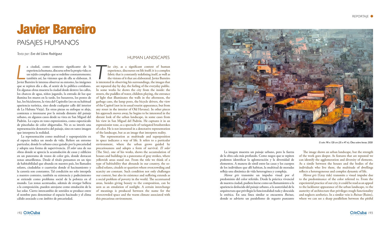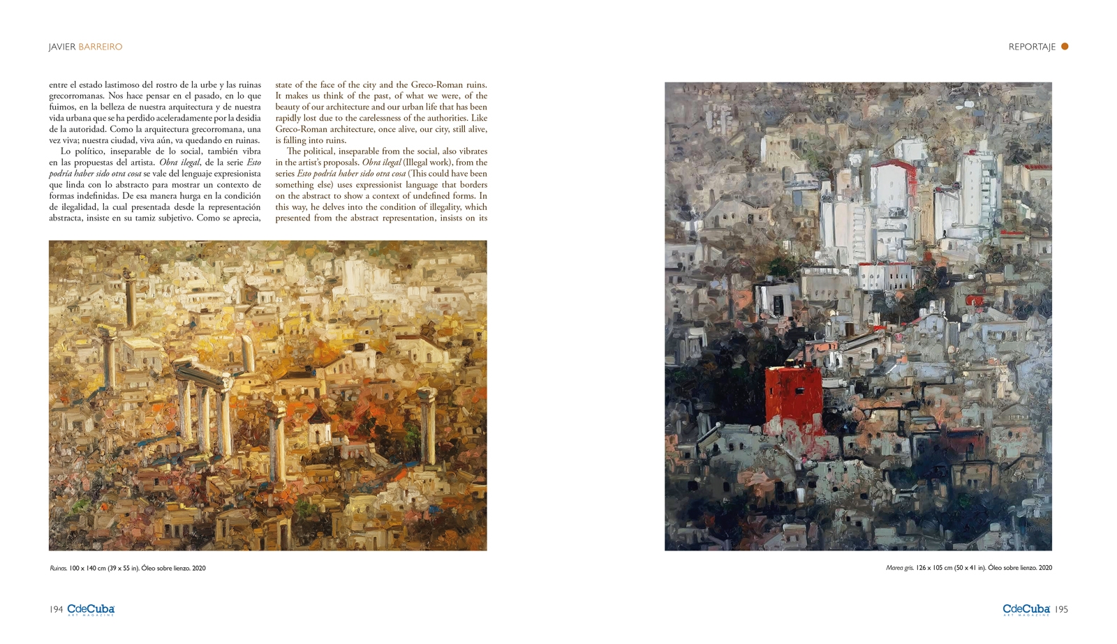 The city, as a significant context of human experience, discourses on life itself; it is a complex fabric that is constantly redefining itself, as well as the visions of it that are elaborated. Javier Barreiro is interested in observing his surroundings, the images that are repeated day by day, the feeling of the everyday public. In some works he shows the city from the inside: the streets, the puddles of water, children playing, the entrance of light that illuminates the walls in the afternoon, the garbage cans, the lamp posts, the bicycle drivers, the view of the Capitol (not in its usual tourist appearance, but from any street in the interior of Old Havana). In other pieces his approach moves away, he begins to be interested in the distant look of the urban landscape, in some cases from his view in San Miguel del Padrón. He captures it in an expressionist tone, as a spectacle of variegated brushstrokes of color. He is not interested in a denotative representation of the landscape, but as an image that interprets reality.