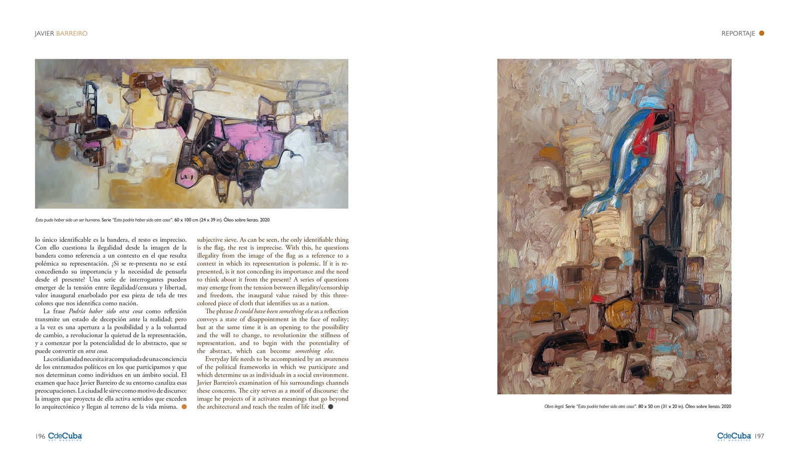 The political, inseparable from the social, also vibrates in the artist’s proposals. Obra ilegal (Illegal work), from the series Esto podría haber sido otra cosa (This could have been something else) uses expressionist language that borders on the abstract to show a context of undefined forms. In this way, he delves into the condition of illegality, which presented from the abstract representation, insists on its subjective sieve. As can be seen, the only identifiable thing is the flag, the rest is imprecise. With this, he questions illegality from the image of the flag as a reference to a context in which its representation is polemic. If it is re-presented, is it not conceding its importance and the need to think about it from the present? A series of questions may emerge from the tension between illegality/censorship and freedom, the inaugural value raised by this three-colored piece of cloth that identifies us as a nation.