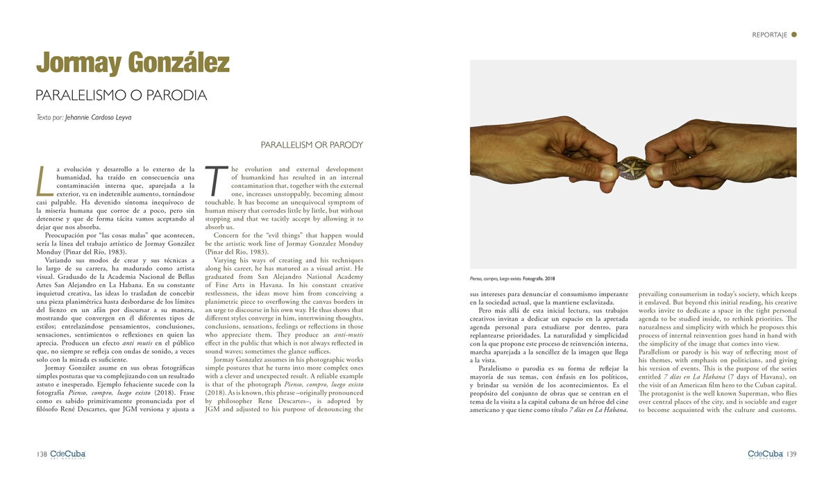 Jormay Gonzalez assumes in his photographic works simple postures that he turns into more complex ones with a clever and unexpected result. A reliable example is that of the photograph Pienso, compro, luego existo (I think, I buy, then I exist) (2018). As is known, this phrase –originally pronounced by philosopher Rene Descartes–, is adopted by JGM and adjusted to his purpose of denouncing the prevailing consumerism in today’s society, which keeps it enslaved. But beyond this initial reading, his creative works invite to dedicate a space in the tight personal agenda to be studied inside, to rethink priorities. The naturalness and simplicity with which he proposes this process of internal reinvention goes hand in hand with the simplicity of the image that comes into view.