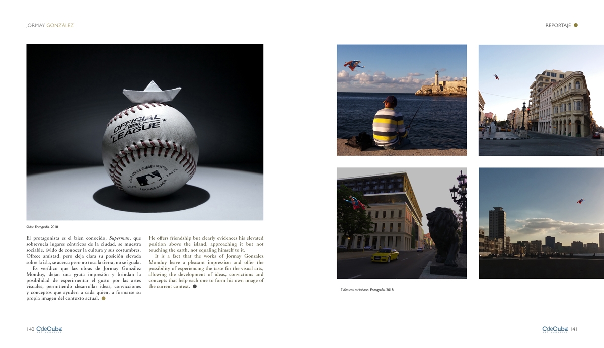 Parallelism or parody is his way of reflecting most of his themes, with emphasis on politicians, and giving his version of events. This is the purpose of the series entitled 7 días en La Habana (7 days of Havana), on the visit of an American film hero to the Cuban capital. The protagonist is the well known Superman, who flies over central places of the city, and is sociable and eager to become acquainted with the culture and customs. He offers friendship but clearly evidences his elevated position above the island, approaching it but not touching the earth, not equaling himself to it.