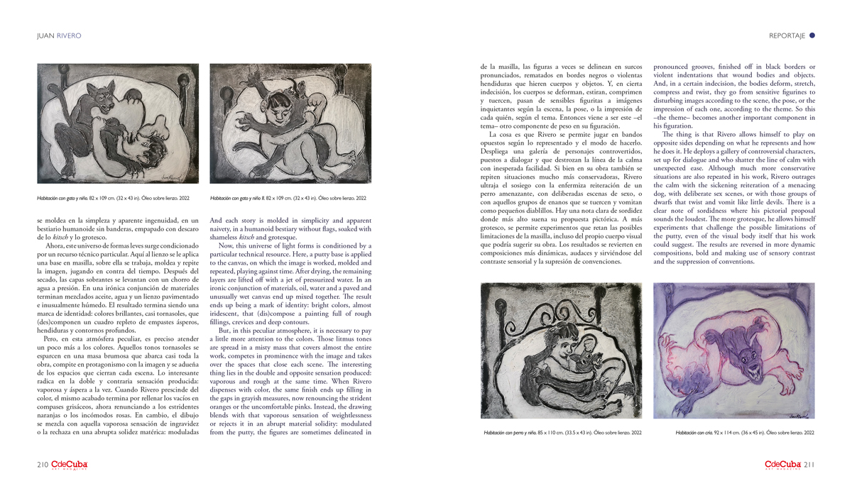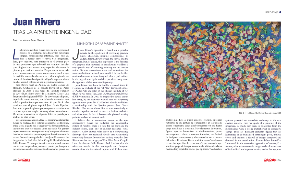 Juan Rivero was born in Antilla, a coastal town in Holguin. A graduate of the “El Alba” Provincial School of Plastic Arts and later of the Higher Institute of Art (ISA), he was part of the Desde Una Pragmática Pedagógica (DUPP) initiative. In 2007 he migrated to Spain, driven like many, by the economic wound that was deepening again in those years. By 2014 he had already established a relationship with the Spanish painter Juan García Ripollés. This nexus allows him to turn completely to creative experiments and produces a decisive technical and visual turn. In fact, it becomes the physical starting point to analyze his current work.