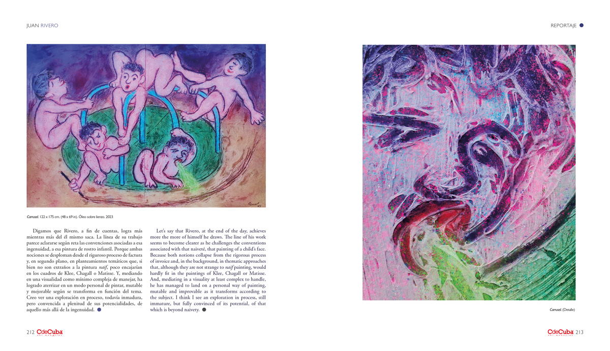 Let’s say that Rivero, at the end of the day, achieves more the more of himself he draws. The line of his work seems to become clearer as he challenges the conventions associated with that naiveté, that painting of a child’s face. Because both notions collapse from the rigorous process of invoice and, in the background, in thematic approaches that, although they are not strange to naif painting, would hardly fit in the paintings of Klee, Chagall or Matisse. And, mediating in a visuality at least complex to handle, he has managed to land on a personal way of painting, mutable and improvable as it transforms according to the subject. I think I see an exploration in process, still immature, but fully convinced of its potential, of that which is beyond naivety.