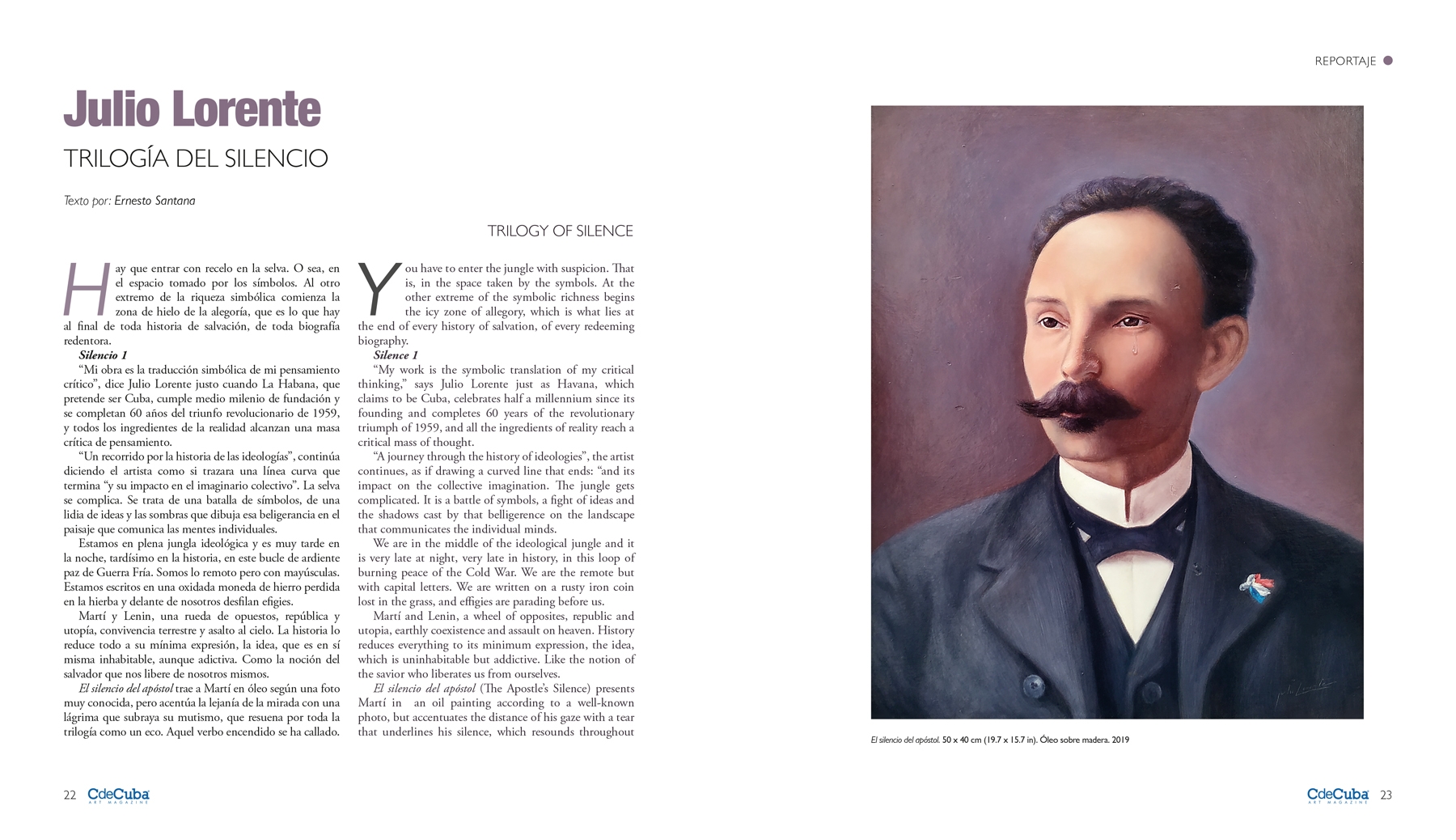 El silencio del apóstol (The Apostle’s Silence) presents Martí in an oil painting according to a well-known photo, but accentuates the distance of his gaze with a tear that underlines his silence, which resounds throughout the trilogy like an echo. That ardent verb has remained silent. Like a farewell. The nobility of the canvas’s fabric will soon be followed by the density of the statue.