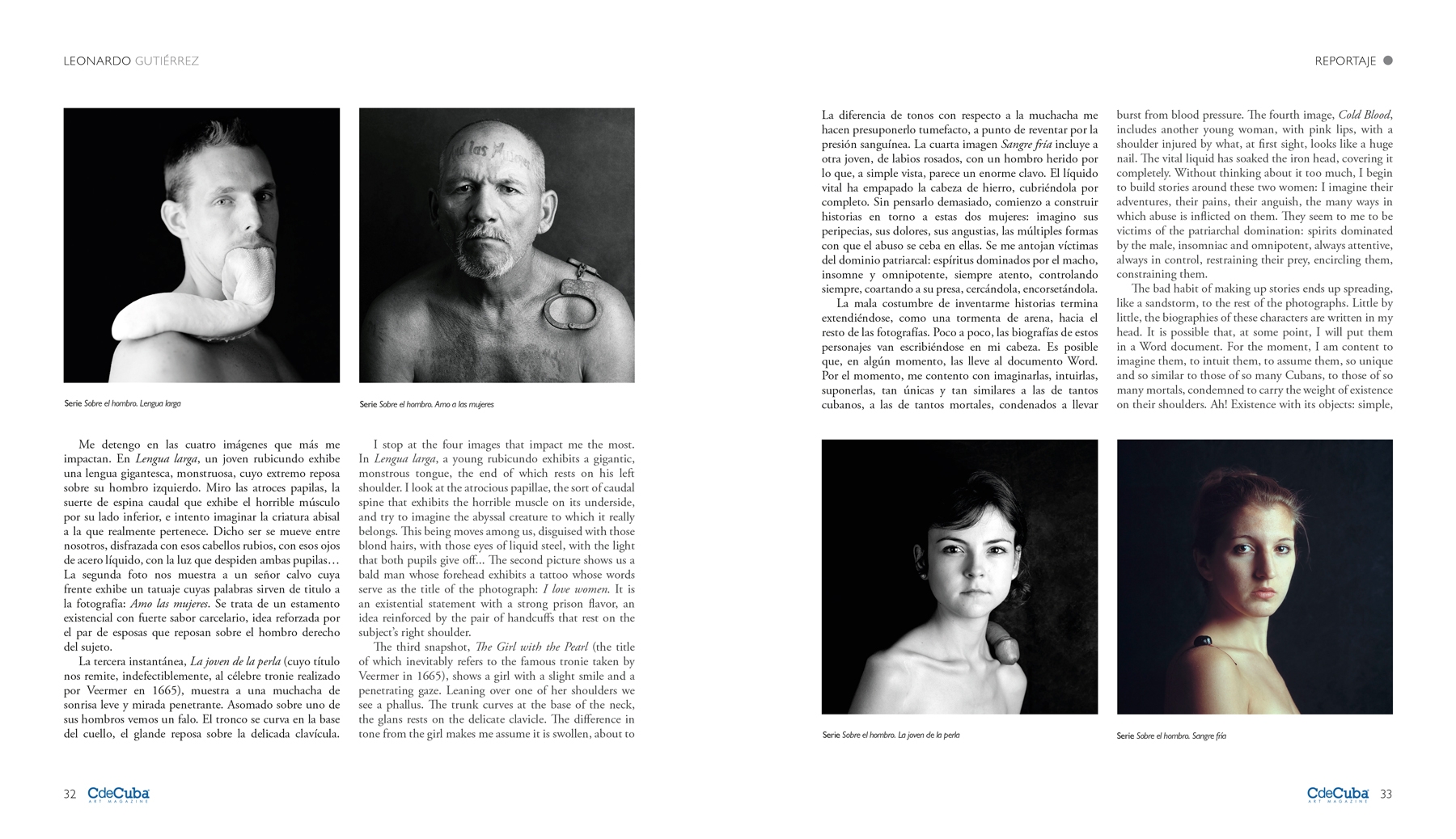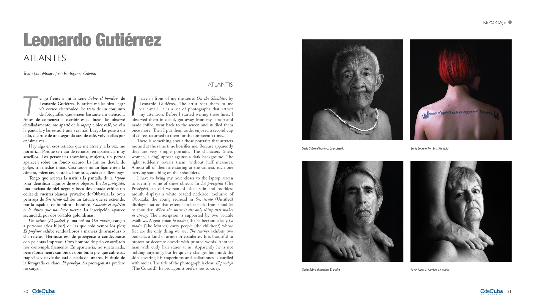 I have in front of me the series On the Shoulder, by Leonardo Gutiérrez. The artist sent them to me via e-mail. It is a set of photographs that attract my attention. Before I started writing these lines, I observed them in detail, got away from my laptop and made coffee, went back to the screen and studied them once more. Then I put them aside, enjoyed a second cup of coffee, returned to them for the umpteenth time…