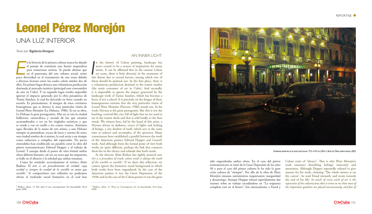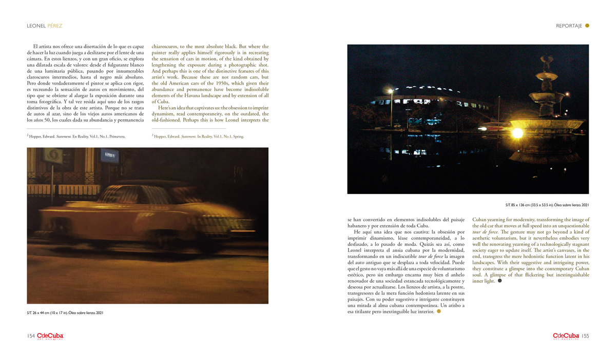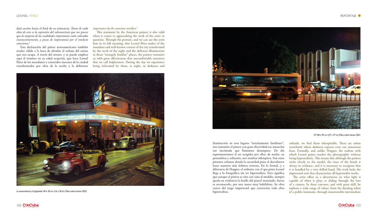In the history of Cuban painting, landscape has never ceased to be a source of inspiration for many artists. It can be affirmed that in the current Cuban art scene, there is little diversity in the treatment of this theme due to several factors, among which two of them should be pointed out. In the first place, there is a voluminous production destined to the tourist market (the main consumer of art in Cuba). And secondly, it is impossible to ignore the impact generated by the landscape work of Tomas Sanchez, which has become a furor, if not a school. It is precisely on the fringes of these homogeneous currents that the very particular vision of Leonel Pérez Morejón (Havana, 1986) stands out. In his work, Havana is the great protagonist. But this is not the bustling, carnival-like city, full of light that we are used to see in the tourist sheds and that is sold loudly to the four winds. We witness here, led by the hand of this artist, a Havana always in darkness, scarce of lights and lacking of beings, a city shadow of itself, which acts at the same time as seducer and accomplice of the spectator. Many connoisseurs have established a parallel between the work of the American painter Edward Hopper and Leonel’s work. And although from the formal point of view both works are quite different, perhaps the link that connects them lies in the silence and solitude that both exude.