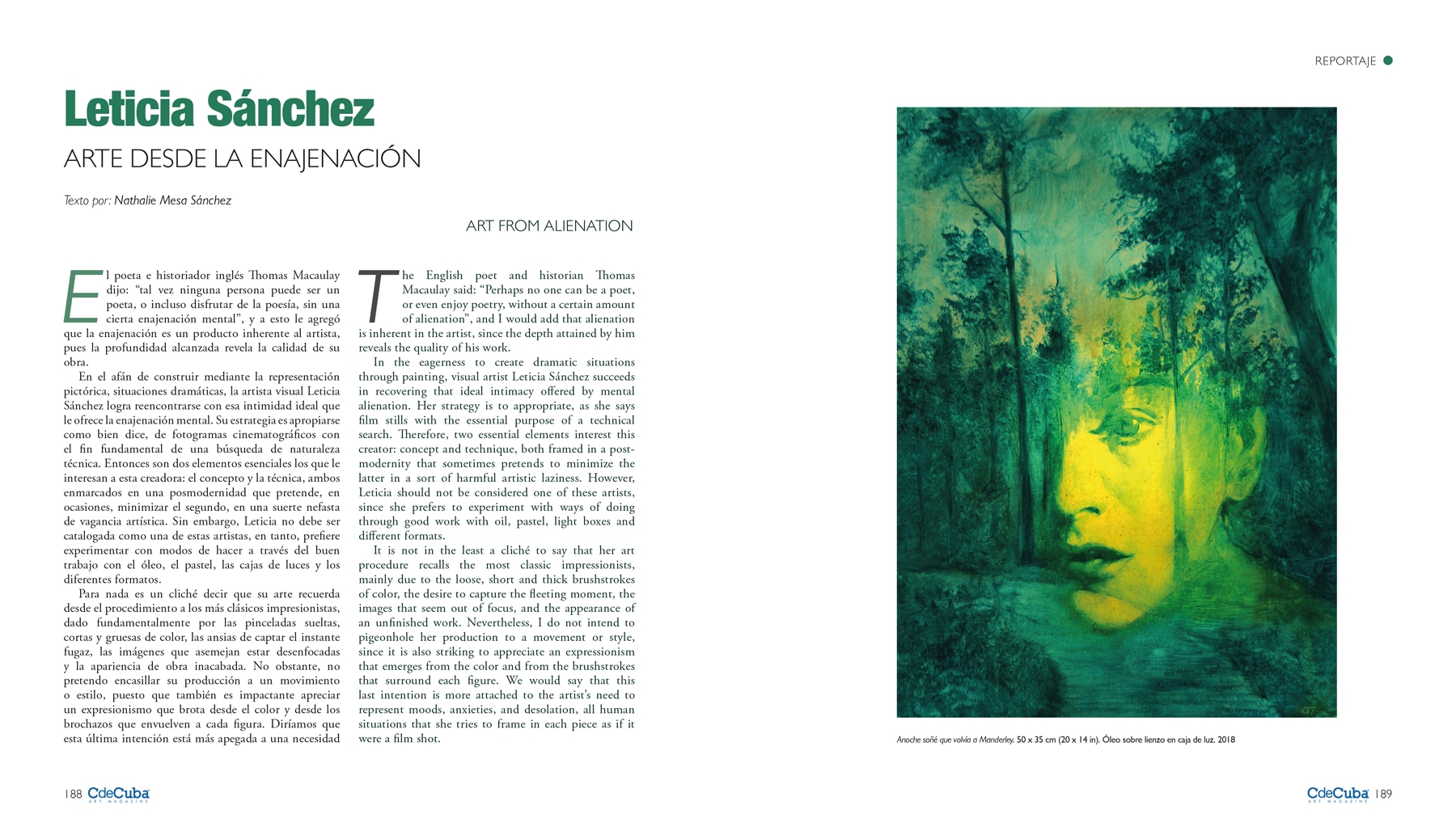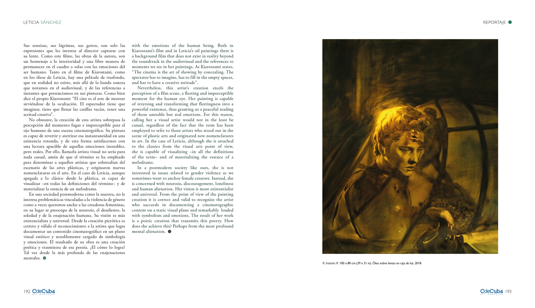 In the eagerness to create dramatic situations through painting, visual artist Leticia Sánchez succeeds in recovering that ideal intimacy offered by mental alienation. Her strategy is to appropriate, as she says film stills with the essential purpose of a technical search. Therefore, two essential elements interest this creator: concept and technique, both framed in a post-modernity that sometimes pretends to minimize the latter in a sort of harmful artistic laziness. However, Leticia should not be considered one of these artists, since she prefers to experiment with ways of doing through good work with oil, pastel, light boxes and different formats.