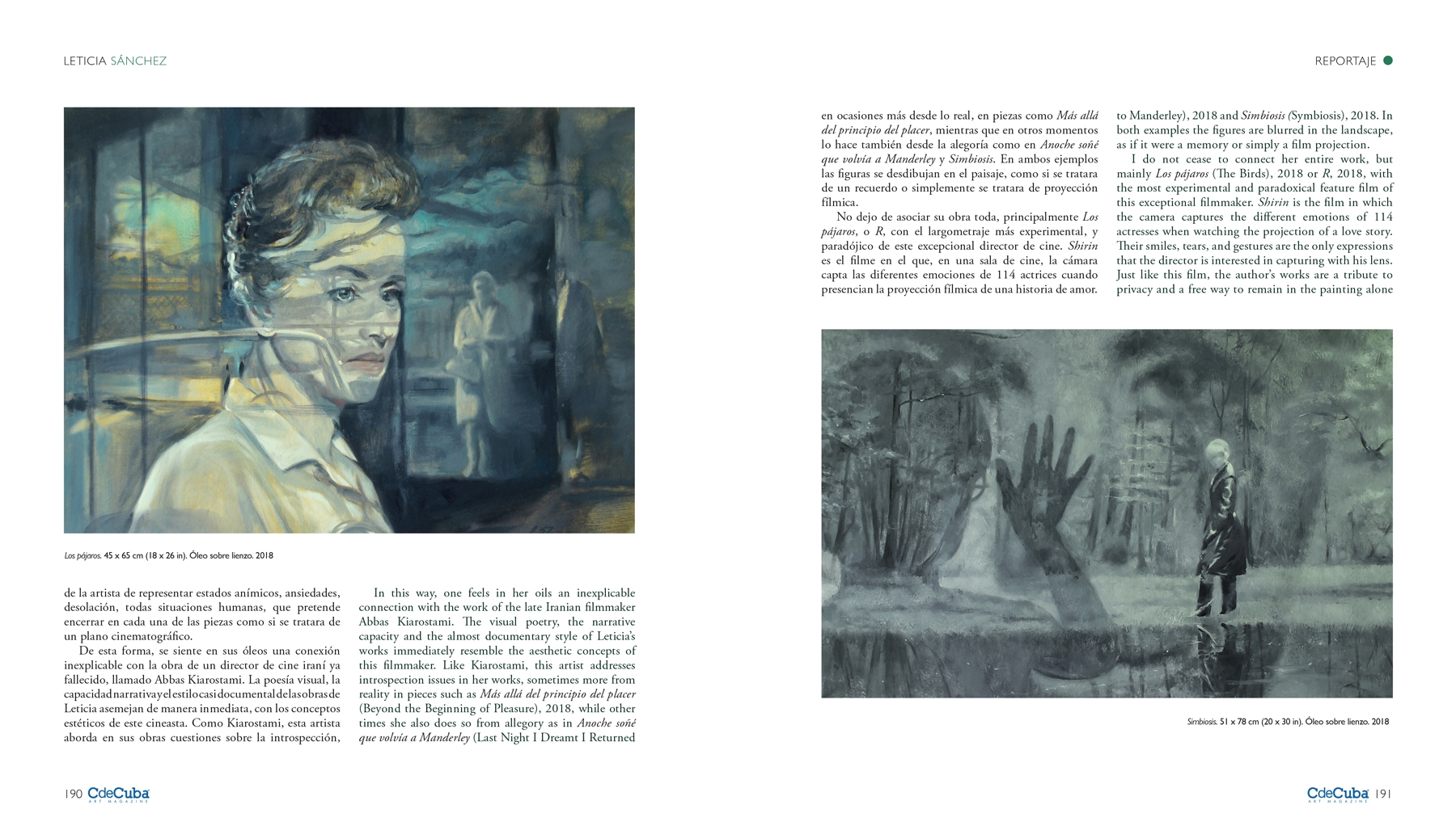 I do not cease to connect her entire work, but mainly Los pájaros (The Birds), 2018 or R, 2018, with the most experimental and paradoxical feature film of this exceptional filmmaker. Shirin is the film in which the camera captures the different emotions of 114 actresses when watching the projection of a love story. Their smiles, tears, and gestures are the only expressions that the director is interested in capturing with his lens. Just like this film, the author’s works are a tribute to privacy and a free way to remain in the painting alone with the emotions of the human being. Both in Kiarostami’s film and in Leticia’s oil paintings there is a background film that does not exist in reality beyond the soundtrack in the audiovisual and the references to moments we see in her paintings. As Kiarostami states, “The cinema is the art of showing by concealing. The spectator has to imagine, has to fill in the empty spaces, and has to have a creative attitude”.