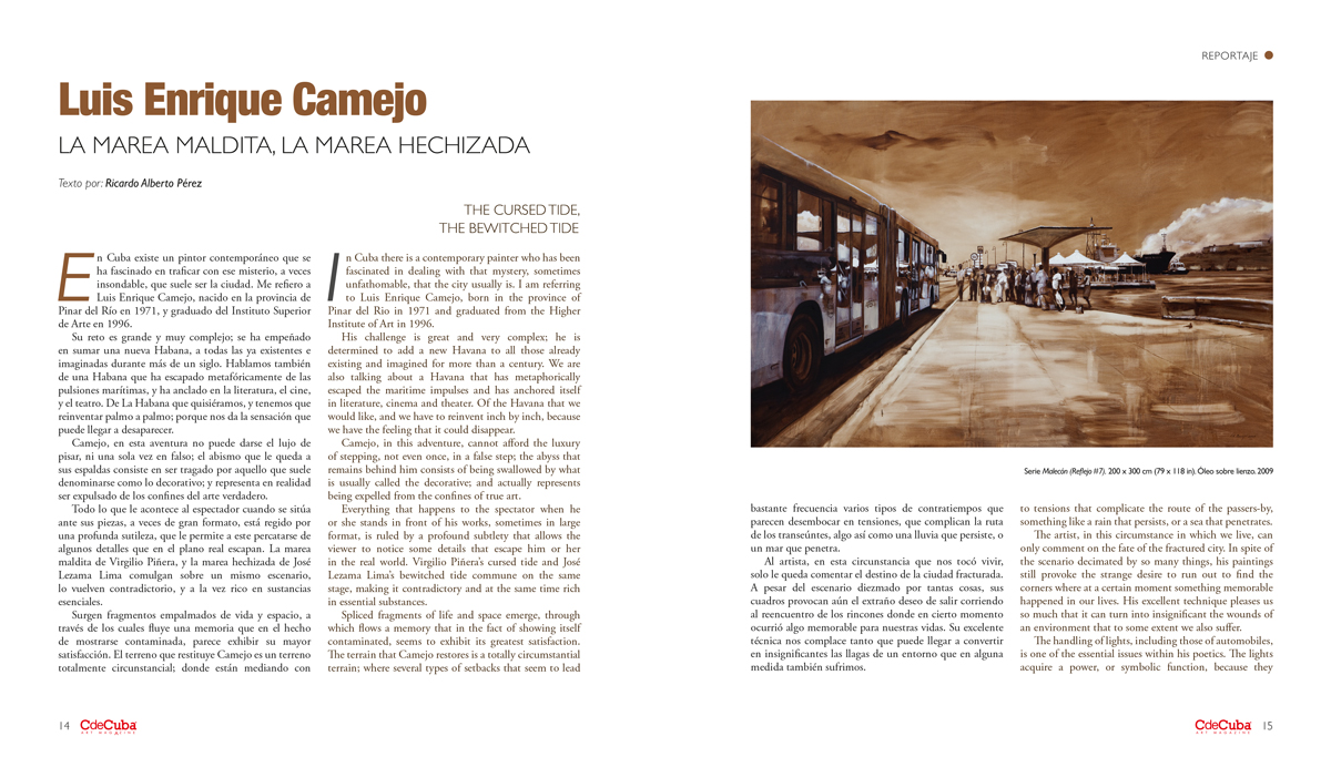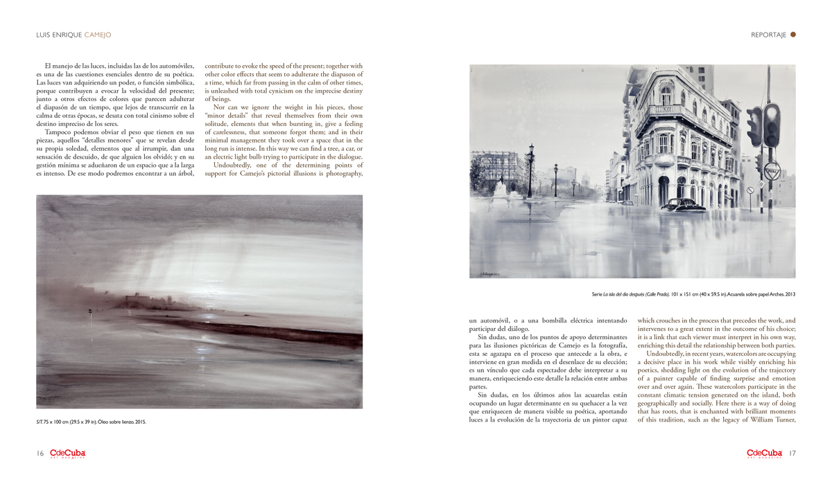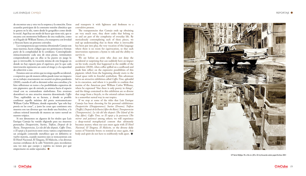If we stop at some of the titles that Luis Enrique Camejo has been choosing for his personal exhibitions: Desaparición (Disappearance), Sueños (Dreams), Tráficos (Traffic), Después de la lluvia (After the Rain), Transparencias (Transparencies), La isla del día después (The Island of the Day After), Coffee Time, or El espejo y la paciencia (The mirror and patience) among others; we will experience a deep-rooted metaphysical content that ultimately becomes matter, when our eyes meet again with El Hotel Nacional, El Tángana, El Malecón, or the diverse daily scenes of Veintitrés Street; to remind us once again, that body and spirit do not have to stubbornly walk apart.