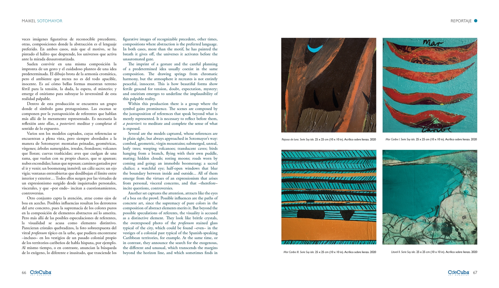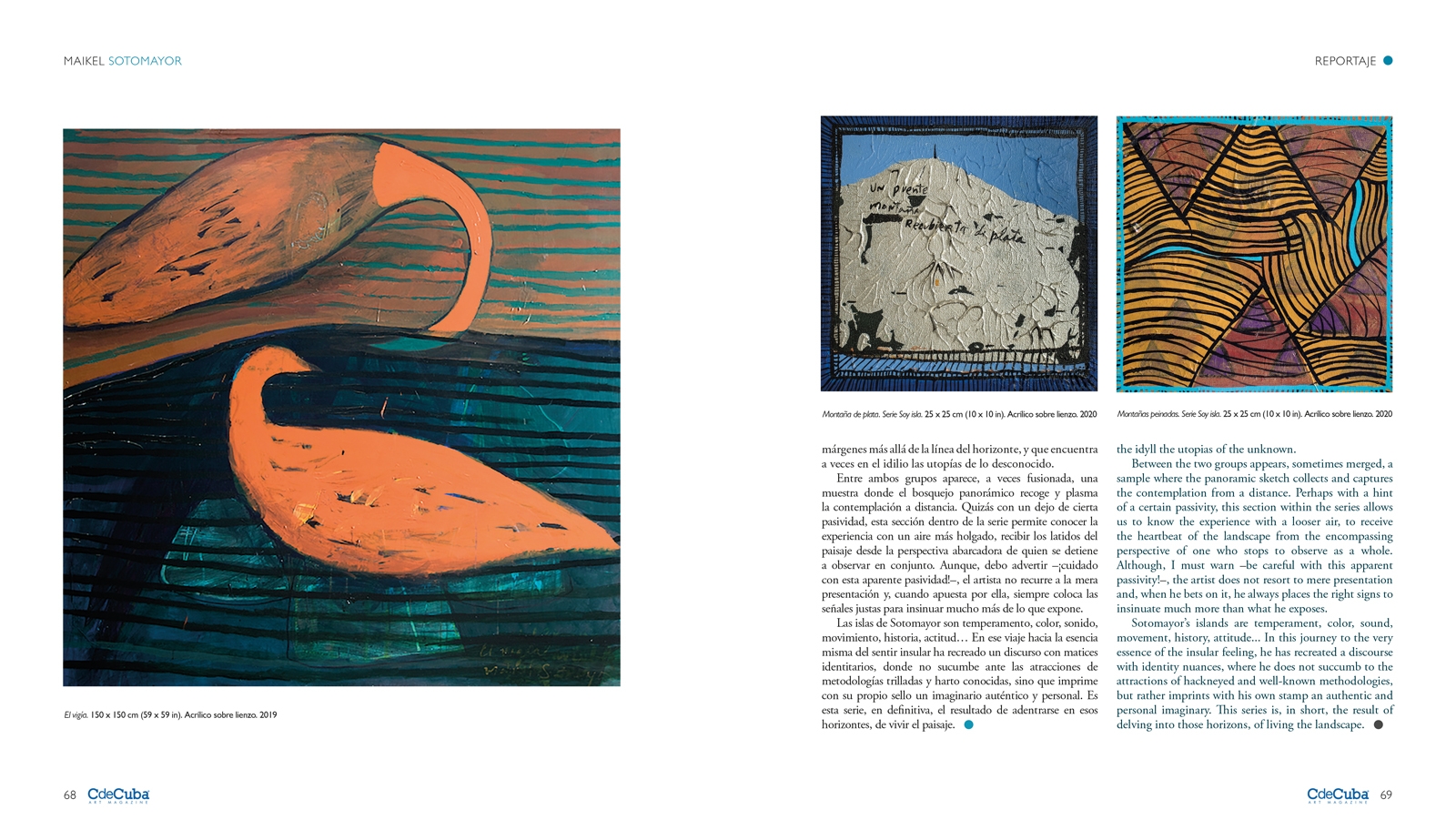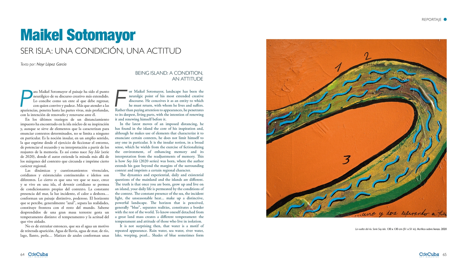 For Maikel Sotomayor, landscape has been the neuralgic point of his most extended creative discourse. He conceives it as an entity to which he must return, with whom he lives and suffers. Rather than paying attention to appearances, he penetrates to its deepest, living parts, with the intention of renewing it and renewing himself before it.