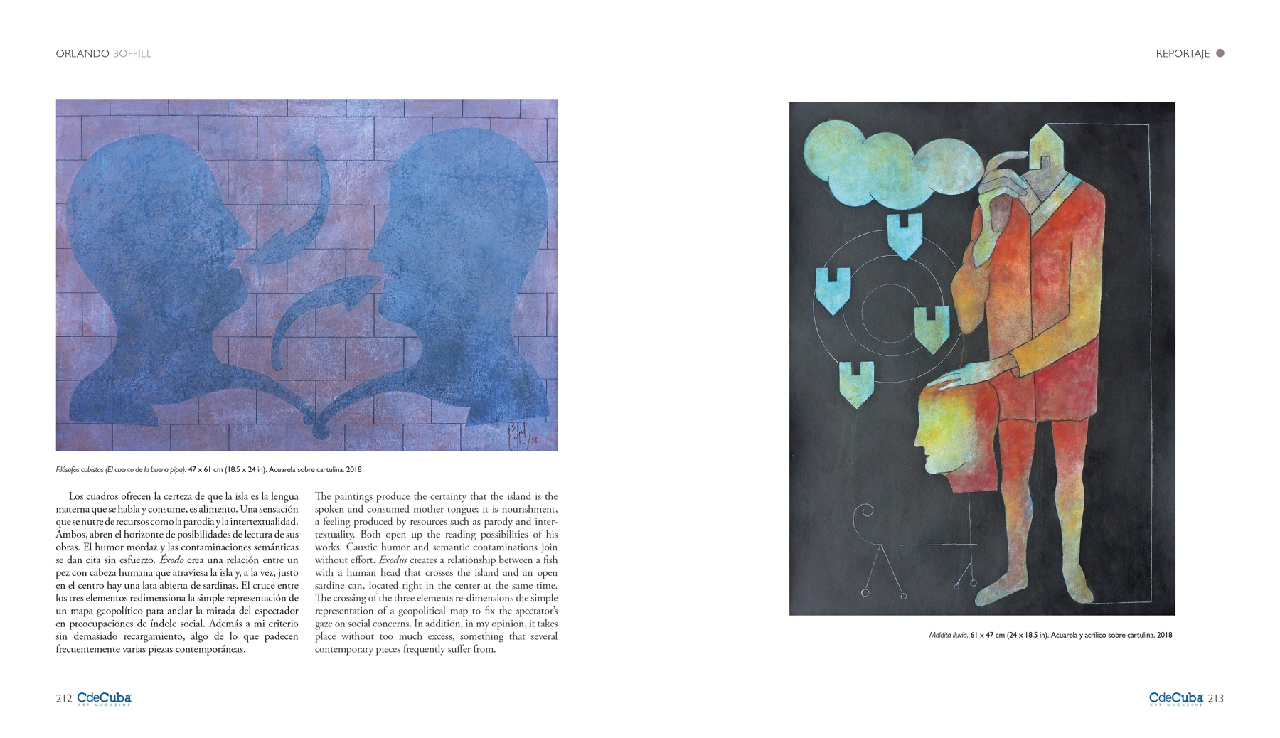 His themes have been very diverse, ranging from some that have been quite promoted internationally, such as the exodus – more centered on personal experiences and reminiscences of the island – to others of a more philosophical nature, as Confesiones de invierno (Winter Confessions), where the black background not only focuses the attention on the central figure – a head flooded with houses or better, lost homes – while he dialogues with a small bird that seems to be in the same situation. It is interesting to choose a bird that has stopped its flight and is far from everything.