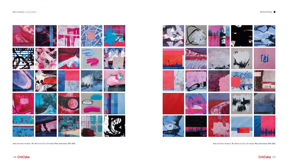 Priesthood of Pleasure leads into pieces of abstract vocation, which aesthetic operation is determined by the intent of the gesture. The series supposes a demarcation/continuity towards Suspicion. The archive, this time, is used to relate and process whether there is a chromatic palette that defines contemporary Cuban art. As a result of this analysis, red, blue, black and white could be catalogued as the colors of success. This selection is then assumed for the production of one hundred small-format paintings that suppose a posture of reverence towards the paradigm. The visual experience of the group deviates from the precedent and places itself as a self-sufficient object, a parodic wink that places the archival precedent more as a pretext than as a finality.