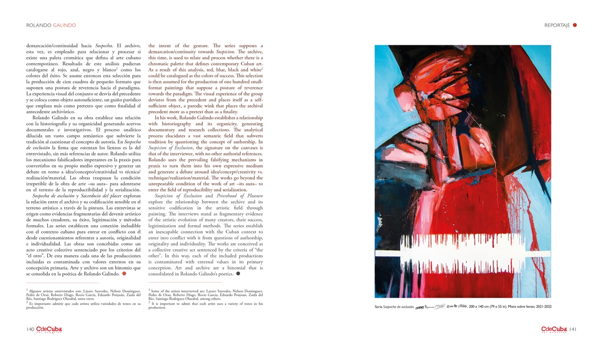 Suspicion of Exclusion and Priesthood of Pleasure explore the relationship between the archive and its sensitive codification in the artistic field through painting. The interviews stand as fragmentary evidence of the artistic evolution of many creators, their success, legitimization and formal methods. The series establish an inescapable connection with the Cuban context to enter into conflict with it from questions of authorship, originality and individuality. The works are conceived as a collective creative act sentenced by the criteria of “the other”. In this way, each of the included productions is contaminated with external values in its primary conception. Art and archive are a binomial that is consolidated in Rolando Galindo’s poetics.