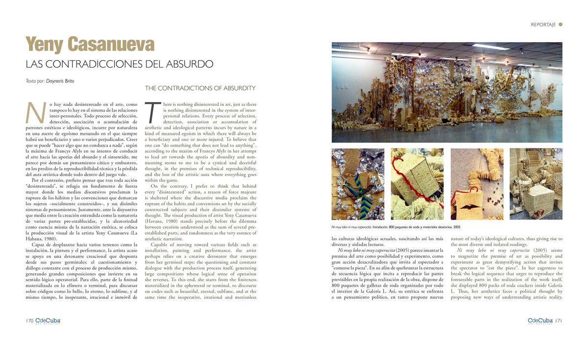 On the contrary, I prefer to think that behind every “disinterested” action, a reason of force majeure is sheltered where the discursive media proclaim the rupture of the habits and conventions set by the socially constructed subjects and their dissimilar systems of thought. The visual production of artist Yeny Casanueva (Havana, 1980) stands precisely before the dilemma between creation understood as the sum of several pre-established parts, and randomness as the very essence of aesthetic narration.