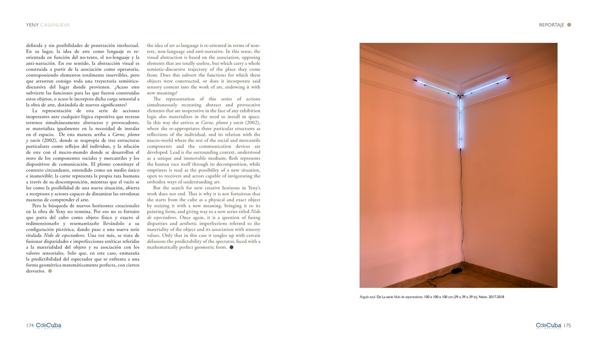 But the search for new creative horizons in Yeny’s work does not end. That is why it is not fortuitous that she starts from the cube as a physical and exact object by resizing it with a new meaning, bringing it to its painting form, and giving way to a new series titled Nido de espectadores. Once again, it is a question of fusing disparities and aesthetic imperfections referred to the materiality of the object and its association with sensory values. Only that in this case it tangles up with certain delusions the predictability of the spectator, faced with a mathematically perfect geometric form.