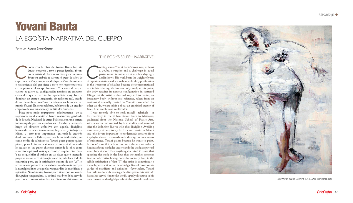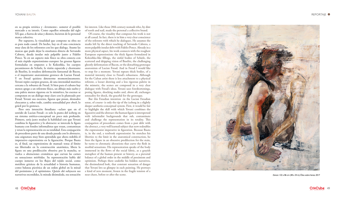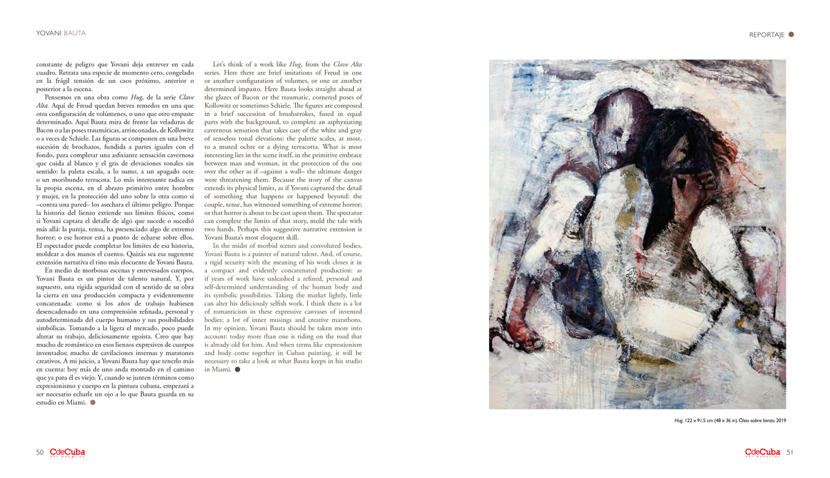In the midst of morbid scenes and convoluted bodies, Yovani Bauta is a painter of natural talent. And, of course, a rigid security with the meaning of his work closes it in a compact and evidently concatenated production: as if years of work have unleashed a refined, personal and self-determined understanding of the human body and its symbolic possibilities. Taking the market lightly, little can alter his deliciously selfish work. I think there is a lot of romanticism in these expressive canvases of invented bodies; a lot of inner musings and creative marathons. In my opinion, Yovani Bauta should be taken more into account: today more than one is riding on the road that is already old for him. And when terms like expressionism and body come together in Cuban painting, it will be necessary to take a look at what Bauta keeps in his studio in Miami.