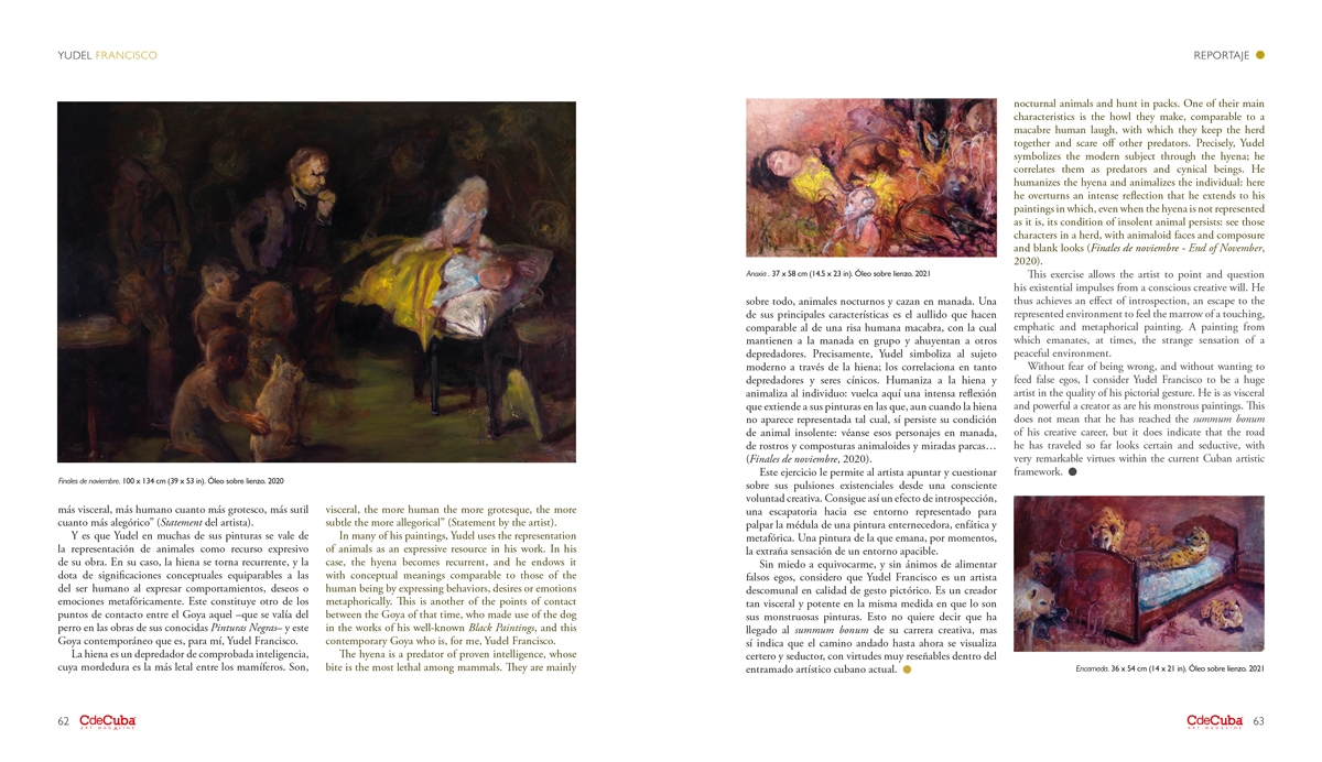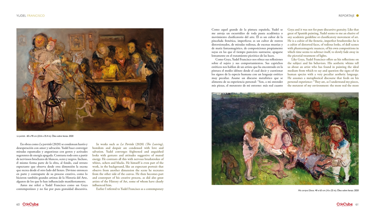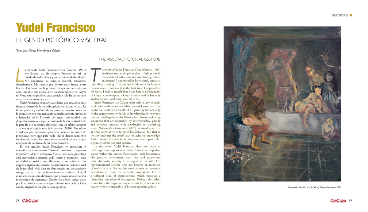 The work of Yudel Francisco Cruz (Güines, 1991) fascinates me, as simple as that. It brings out in me a state of seduction and overflowing retinal enjoyment. I am moved by his visceral, sarcastic, unbridled painting. It shakes me inside to be in front of his canvases. I confess that the first time I approached his work, I said to myself that I was before a descendant of Goya: a contemporary Goya whose creation has only awakened more and more interest in me.