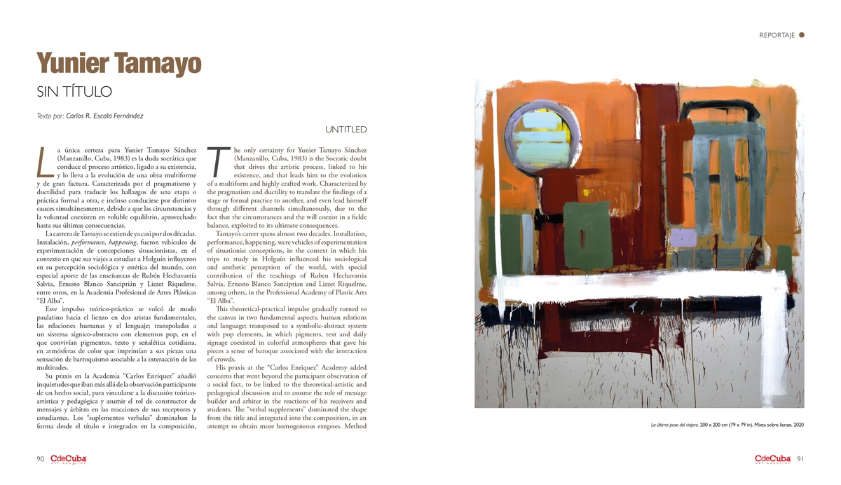 Tamayo’s career spans almost two decades. Installation, performance, happening, were vehicles of experimentation of situationist conceptions, in the context in which his trips to study in Holguín influenced his sociological and aesthetic perception of the world, with special contribution of the teachings of Ruben Hechavarria Salvia, Ernesto Blanco Sanciprian and Lizzet Riquelme, among others, in the Professional Academy of Plastic Arts “El Alba”.