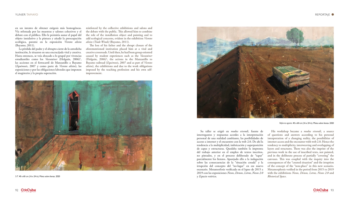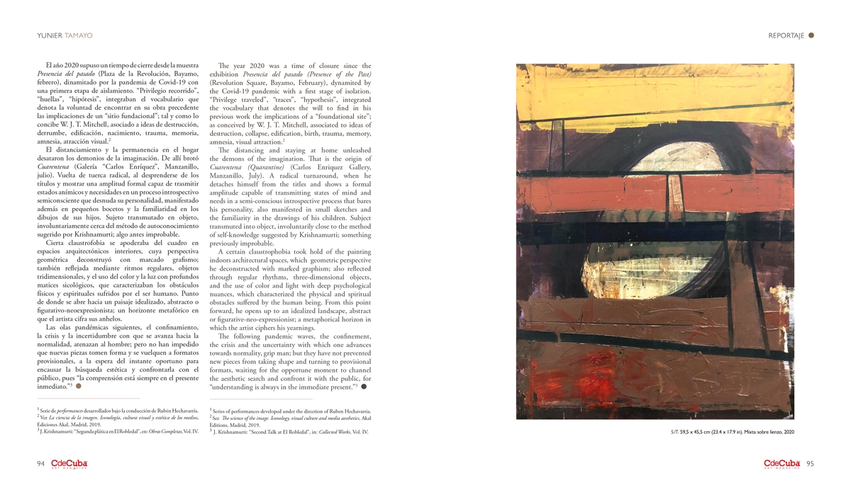 The year 2020 was a time of closure since the exhibition Presencia del pasado (Presence of the Past) (Revolution Square, Bayamo, February), dynamited by the Covid-19 pandemic with a first stage of isolation. “Privilege traveled”, “traces”, “hypothesis”, integrated the vocabulary that denotes the will to find in his previous work the implications of a “foundational site”; as conceived by W. J. T. Mitchell, associated to ideas of destruction, collapse, edification, birth, trauma, memory, amnesia, visual attraction.2