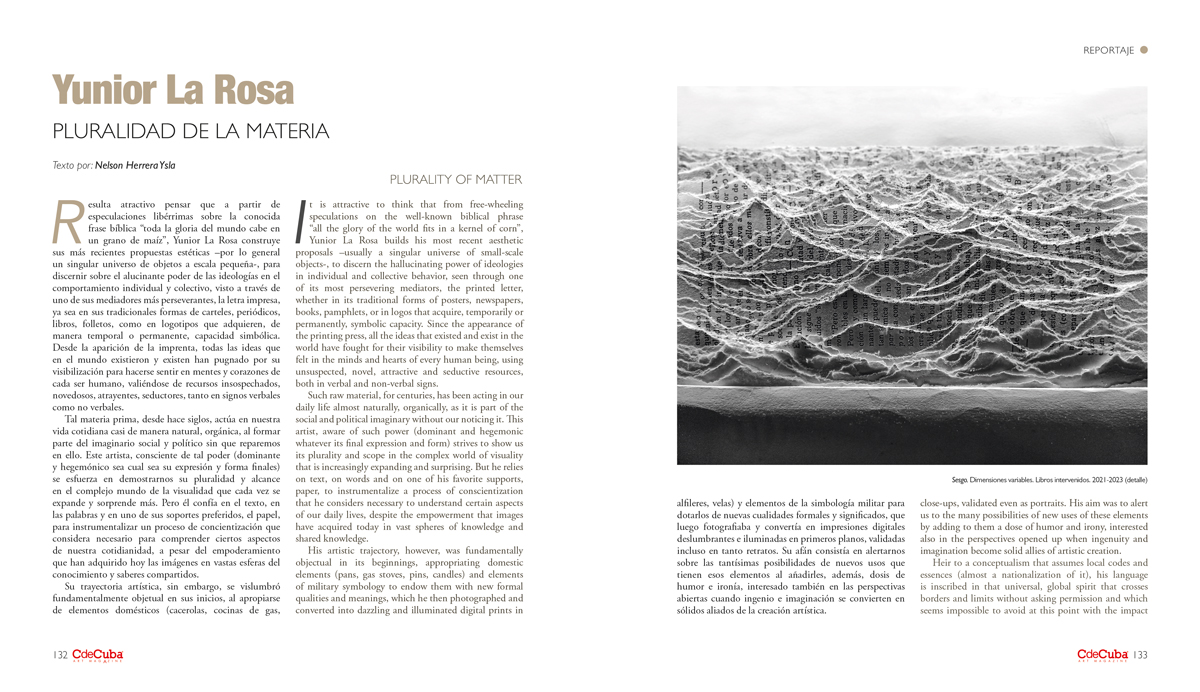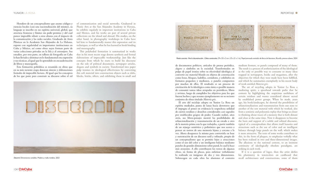 The art of recycling adopts in Yunior La Rosa a mediating spirit, a spearhead towards paths that he contests by highlighting the suspicious usefulness of certain residues and wastes considered almost sacred by established power groups. When he made, years ago, his book-landscapes, he showed the possibilities of refunctionalization and transmutation from one state to another of the raw material with which he worked, also from a semiotic and polysemic replay that brings us closer to thinking about traces of a memory that is both distant and close at the same time. Now it disappears to become the basis and support of a subtle and refined discourse, typical of a conceptualism that allows itself luxuries and attractions such as the use of color and an intelligent balance through large panels on the wall, which makes it more attractive. The texts of some works contribute to this, in the form of plaques, to emphasize verbally what has been realized in two and three-dimensional images. The allusions to the national context, to an insistent continuity of ideologically obsolete paradigms, are striking in each work.