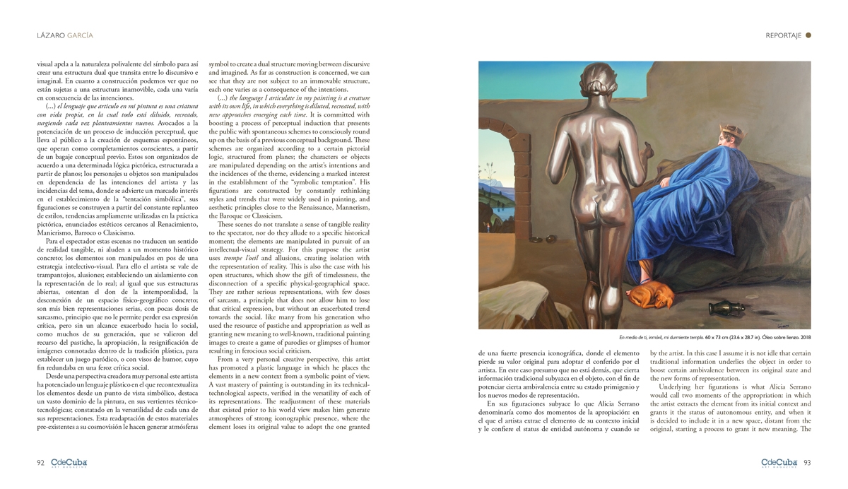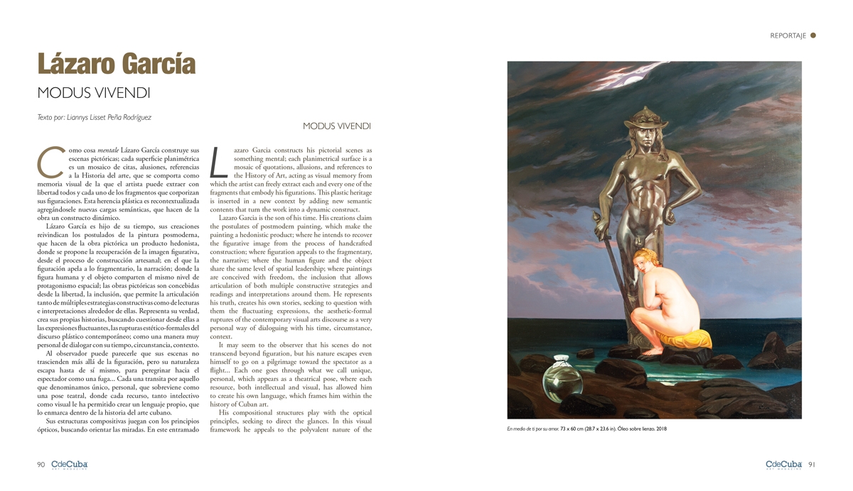 Como cosa mentale Lázaro García construye sus escenas pictóricas; cada superficie planimétrica es un mosaico de citas, alusiones, referencias a la Historia del arte, que se comporta como memoria visual de la que el artista puede extraer con libertad todos y cada uno de los fragmentos que corporizan sus figuraciones. Esta herencia plástica es recontextualizada agregándosele nuevas cargas semánticas, que hacen de la obra un constructo dinámico.