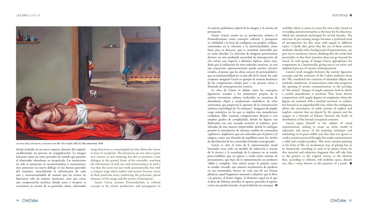 La obra de Lázaro se debate entre los conceptos figurativos actuales y los remanentes propios de la estética noventiana cubana, traducidos en creaciones de abundantes elipsis y mediaciones simbólicas, de valor autónomo; que propician la apertura de la comunicación artística; al privilegio de “lo retiniano”. Imágenes de amplia carga semántica en las que se implica una manufactura cuidadosa. Ellas ostentan composiciones diversas y con amplios grados de complejidad, donde las figuras son delineadas con una acusada atención al realismo, pero ubicadas de una manera imprevisible; donde lo ambiguo permite la articulación de sistemas estables de contenidos explícitos e implícitos; que son colocados por el pintor y el exégeta, como una fórmula de equilibrio entre los niveles de distribución de los contenidos formales-conceptuales.