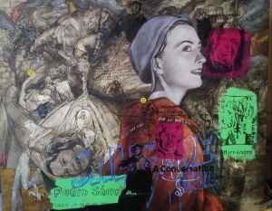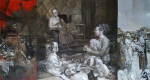 …al centro enhebra el tema de la pasarela y de la familia [se refiere a la pasarela de Chanel en el Paseo del Prado de La Habana en 2016]. En su lateral derecho está Omara Portuondo, tomada de una foto del desfile de Chanel, frente a las modelos de Dior en la URSS. Detrás de ella está el Chori, en una escena del documental PM de Sabá Cabrera Infante y Orlando Jiménez Leal, que fue filmado en 1961, el mismo año en que se declaró el carácter socialista de la Revolución cubana. Todo está pintado a la manera del Realismo Socialista, quizás al modo de Tetyana Yablonska, Arkady Plastov o Vladimir Sérov, que eran naturalistas duros, cerrados a los “efluvios formalistas” de la vanguardia, y donde mejor se demuestra que naturalismo y realismo pueden ser todo lo contrario. La escena de la izquierda es expresionista, y es una apropiación de un cuadro de Boris Ioganson, El interrogatorio de los comunistas (1933). Ioganson pasó de la defensa del Constructivismo al Realismo Socialista más gris y panfletario. He pintado la escena invertida y la he convertido en un rey Saúl que intenta lancear al joven David, futuro rey de Israel (…). Jiménez Leal dijo que luego de la exhibición de PM en Casa de las Américas leyó la novela 1984 de George Orwell y la vivió. No había límites entre realidad y ficción. Hay además en una esquina inferior del cuadro una cita al famoso lubok del barbero que habla de las reformas de Pedro I. El velo de hablar oblicuamente de Cuba en mis cuadros es quizás por autocensura…(2)
